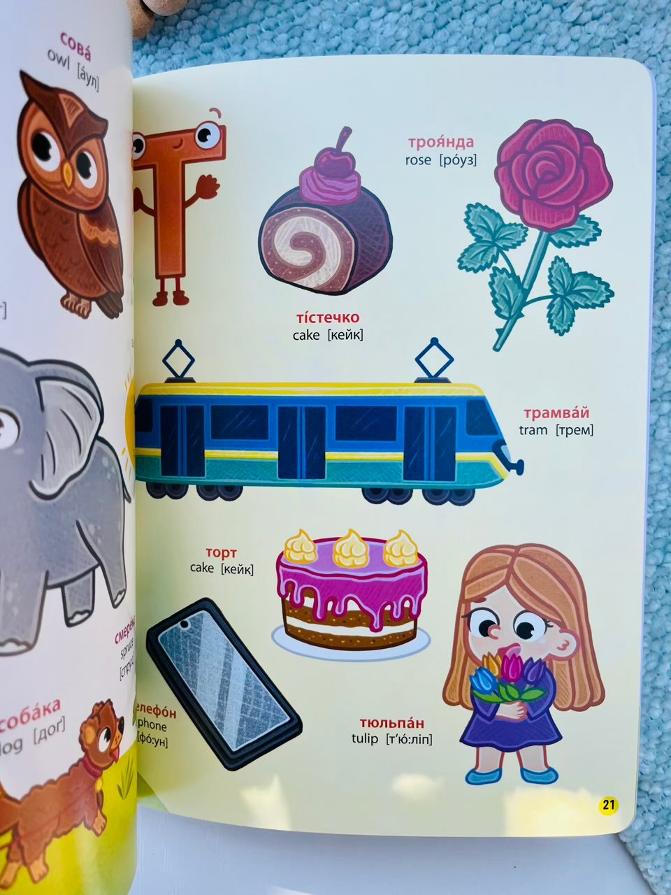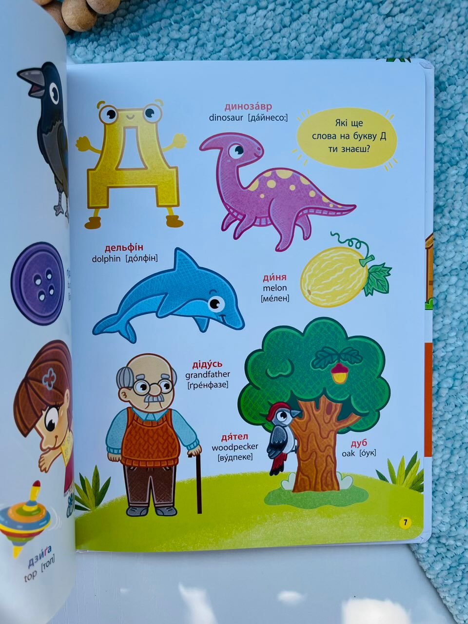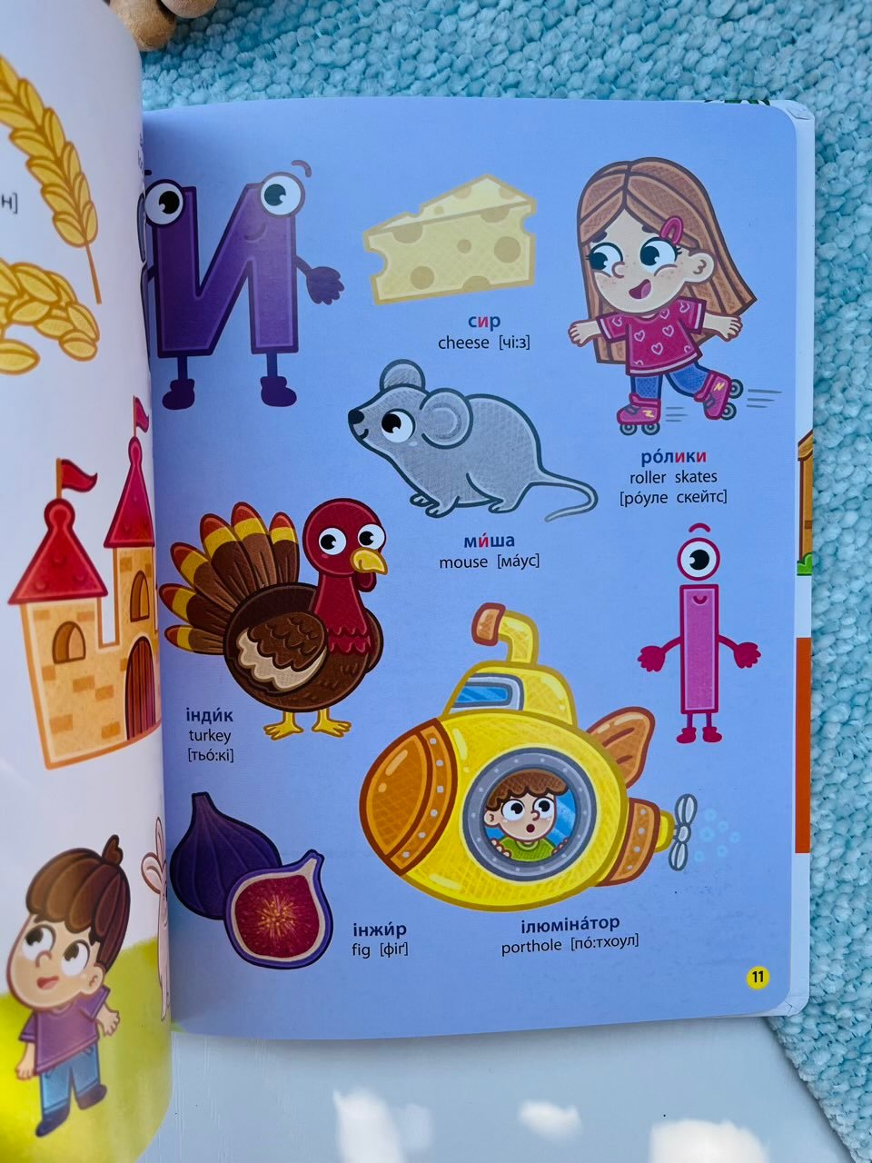 Ця книжка допоможе дитині в ігровій формі вивчити абетку та засвоїти нові слова, навчитися чітко та правильно їх вимовляти, а також сприятиме розвитку логічного мислення та вивченню навколишнього світу. На кожному розвороті малюк бачитиме великі кольорові малюнки, запам’ятовуватиме нові слова, відшукуватиме задані предмети, відповідатиме на запитання. Підписи в книжці подано двома мовами, що зробить вивчення англійської легким і веселим навіть для найменших.