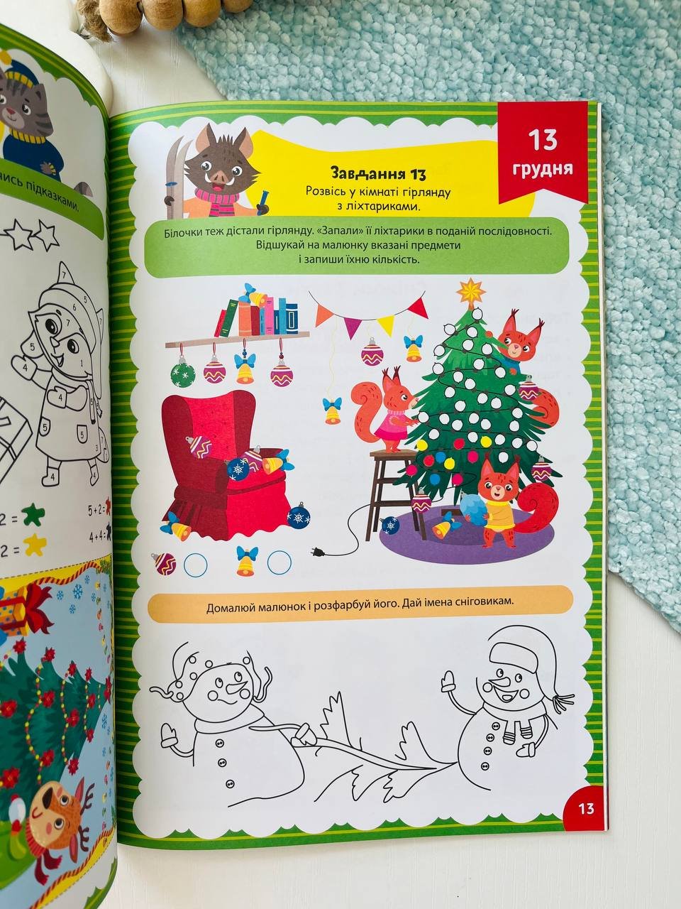 Разом із цією книжкою малюк підготується до зимових свят та проведе час в очікуванні Нового року цікаво та з користю. Видання містить великий плакат-календар на грудень, творчі й розвивальні завдання на кожен день місяця, 230 яскравих наліпок для виконання завдань і заповнення календаря, а також лист святому Миколаю та лист для планів на наступний рік.
