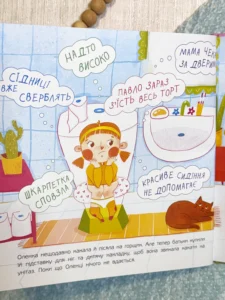 Маленька Оленка, як і всі діти її віку, лише вчиться ходити на унітаз. Іноді це у неї виходить, а іноді — ні, і вона соромиться. Однак у дівчинки є чарівна “Книжка про какашки”, яка допомагає їй знайти друзів у туалеті. Книга з гумором розповідає малюкам про важливість цього процесу, розкриває всі його тонкощі: колір, форму та користь какашок, а також дає поради щодо правил гігієни.