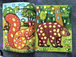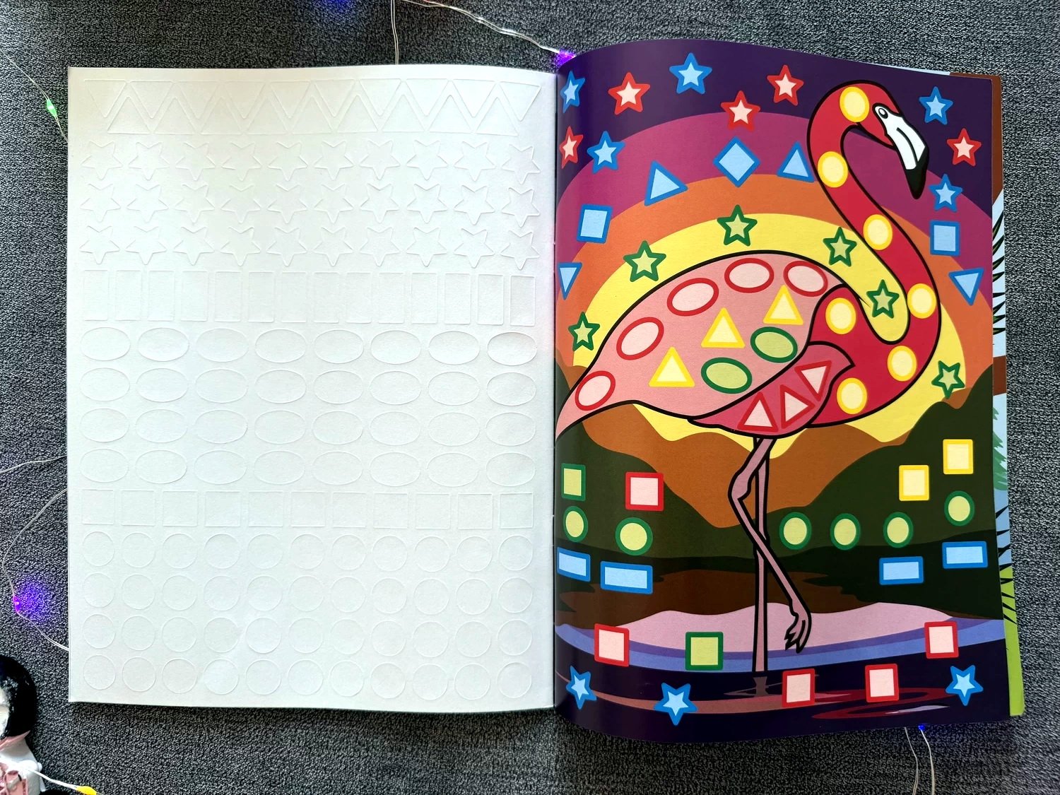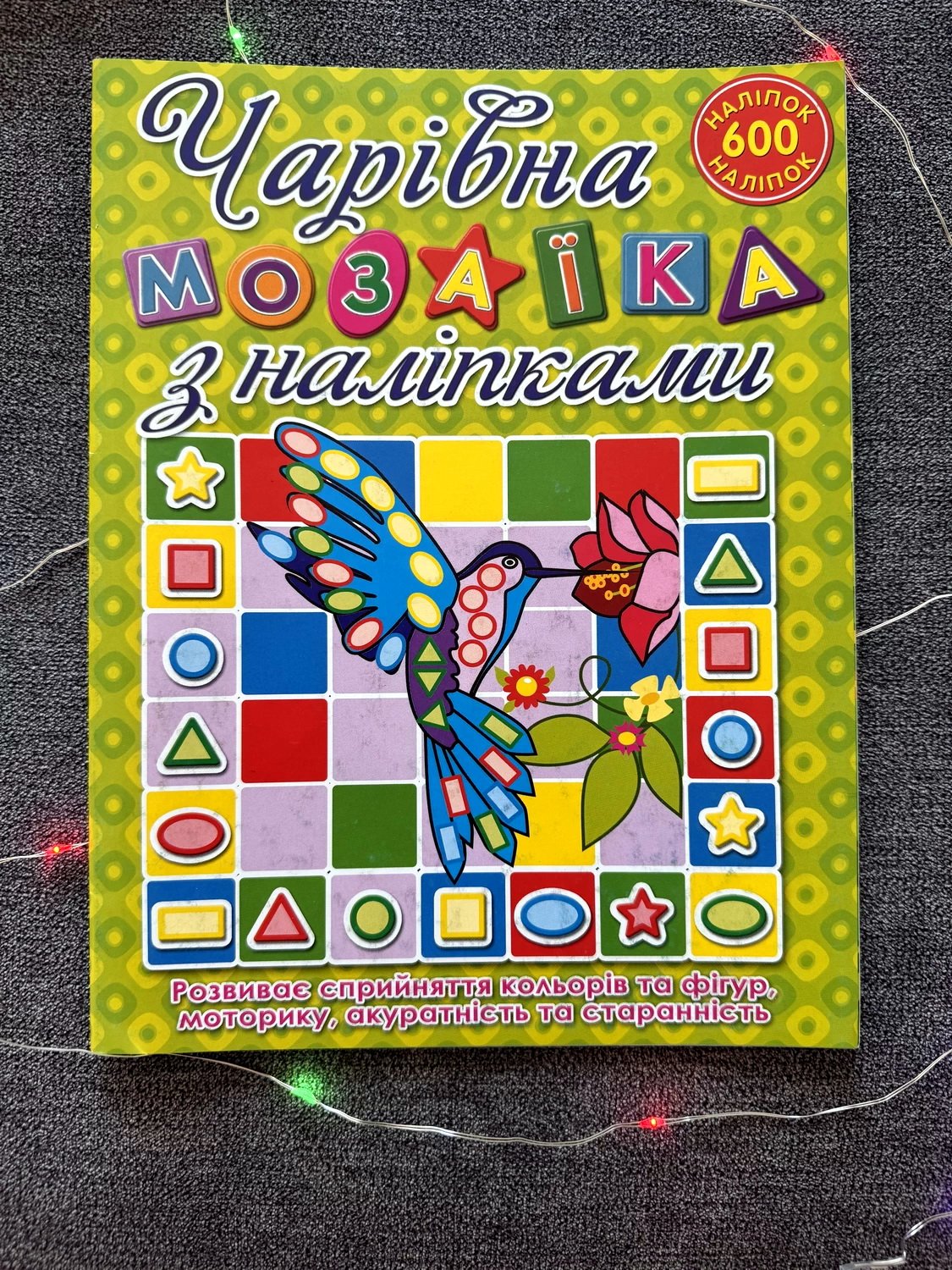 “Чарівна мозаїка з наліпками” — серія книжок, що включає 600 наліпок, з допомогою яких діти можуть створювати яскраві та цікаві зображення, працюючи з мозаїкою. Кожен комплект має свою унікальну тематику, наприклад, зображення черепашки чи равлика, що стимулює творчість та уяву у дітей.
