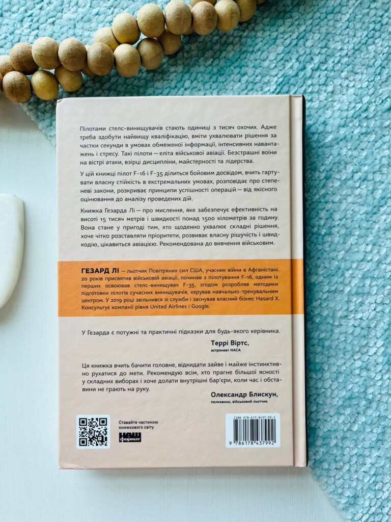 У цій книжці пілот F-16 і F-35 ділиться бойовим досвідом, вчить гартувати власну стійкість в екстремальних умовах, розповідає про три степеневі закони, розкриває принципи успішності операцій — від якісного оцінювання до аналізу проведених дій.