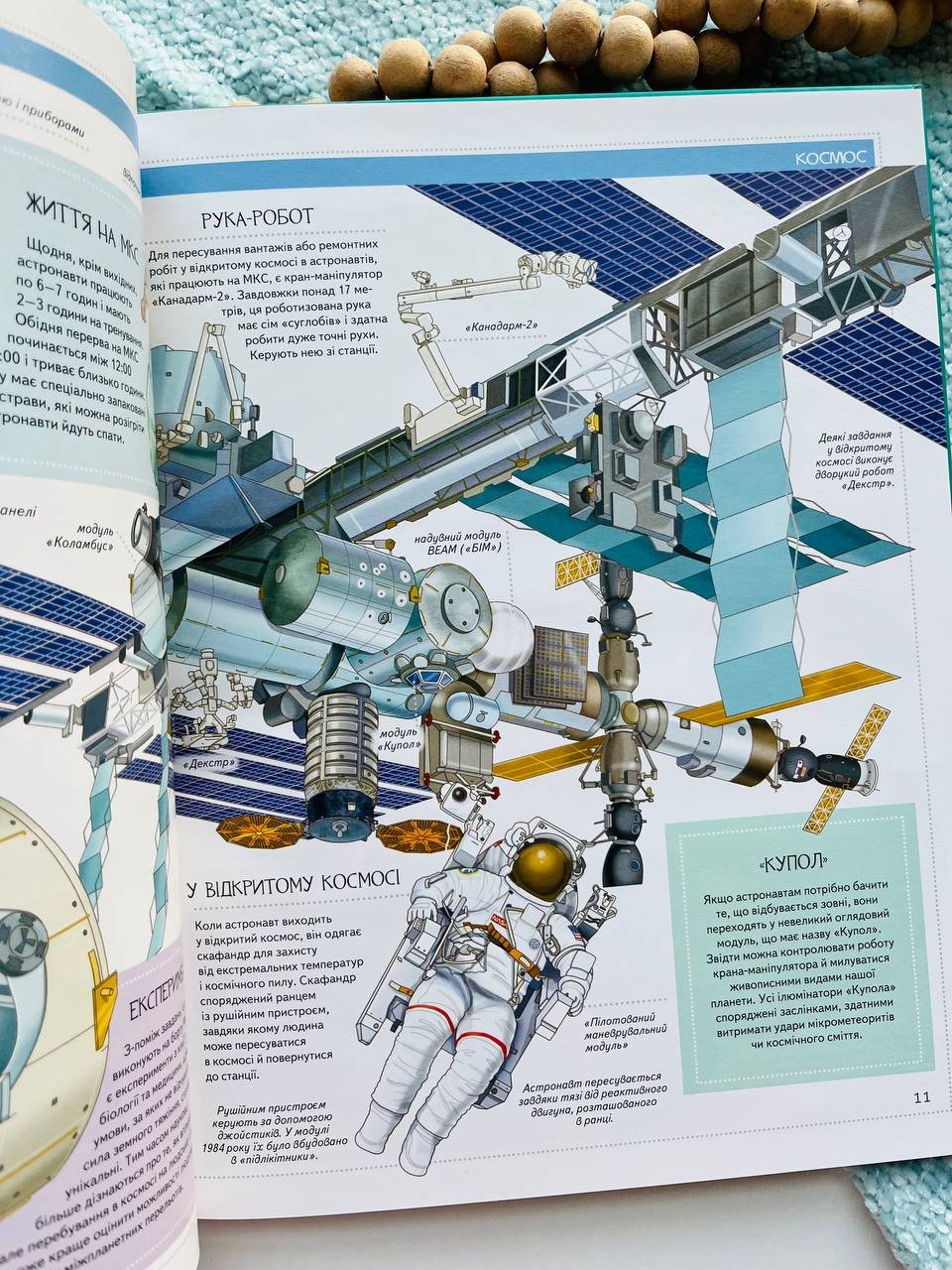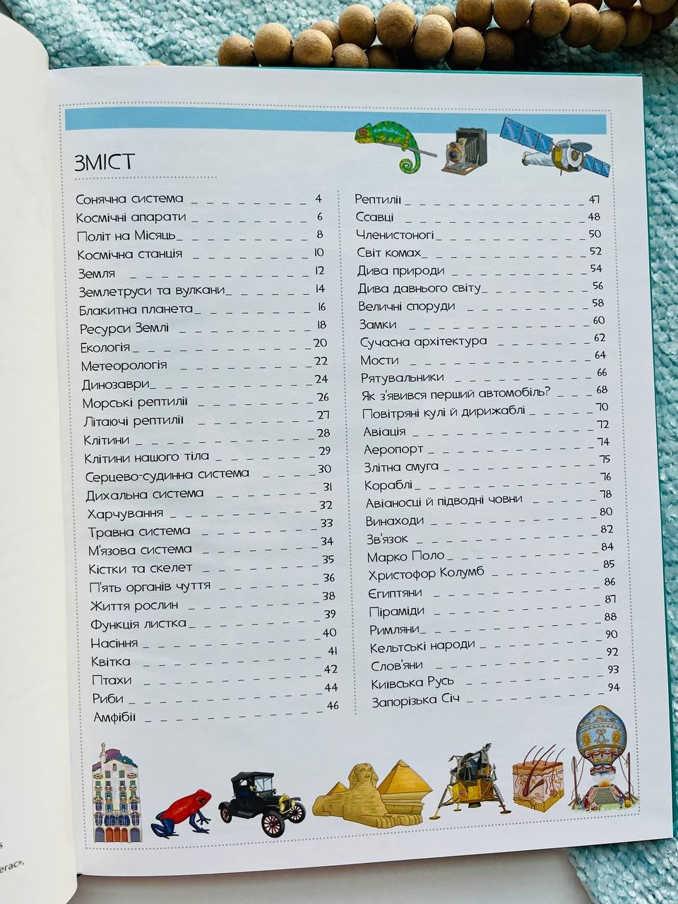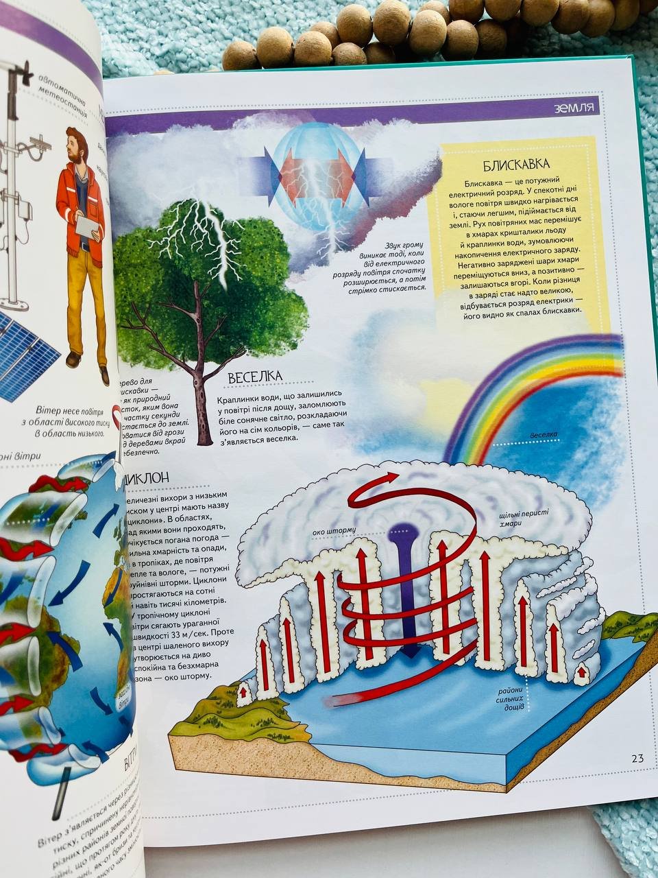 Кожна тема подана через наочні схеми, великі підписи, стрілки й «факто-картки» — дитина не просто читає, а бачить і розуміє