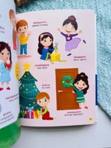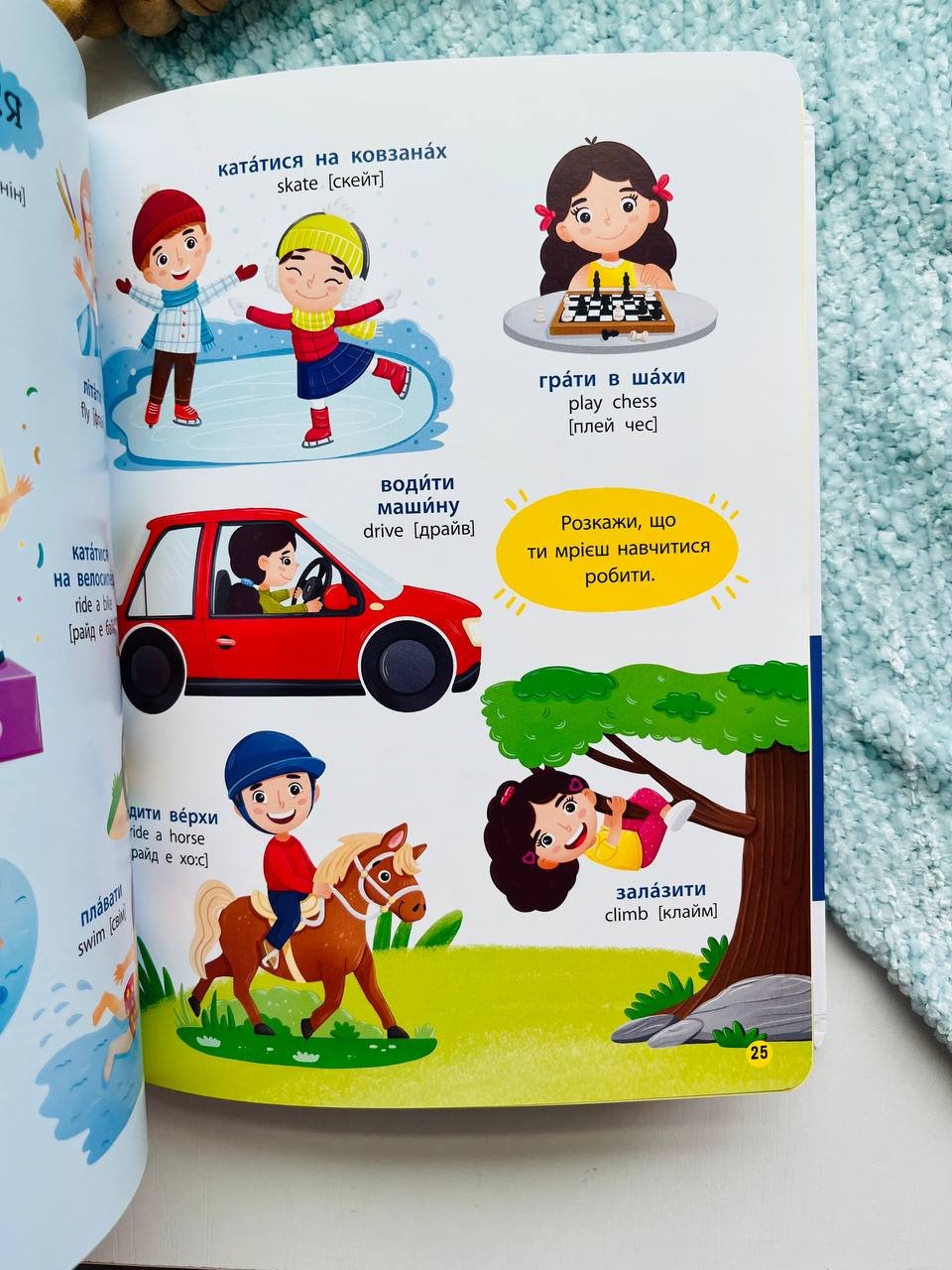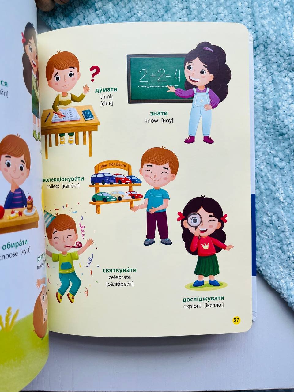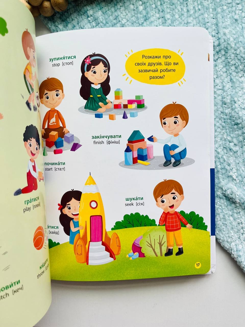 Ця книжка допоможе дитині в ігровій формі засвоїти нові слова, навчитися чітко та правильно їх вимовляти, а також сприятиме розвитку логічного мислення та вивченню навколишнього світу. На кожному розвороті малюк бачитиме великі кольорові малюнки, запам’ятовуватиме нові слова, відшукуватиме задані предмети, відповідатиме на запитання. Підписи в книжці подано двома мовами, що зробить вивчення англійської легким і веселим навіть для найменших.