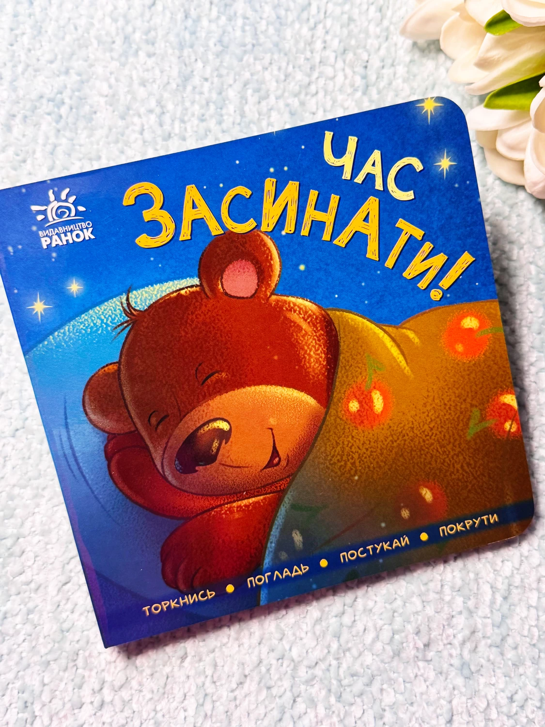 Контактна книжка «Час засинати!» — це незвична інтерактивна книжка-картонка. «Чому?» — спитаєте ви, бо вона не має рухливих елементів і виконана без застосування додаткових тактильних матеріалів.