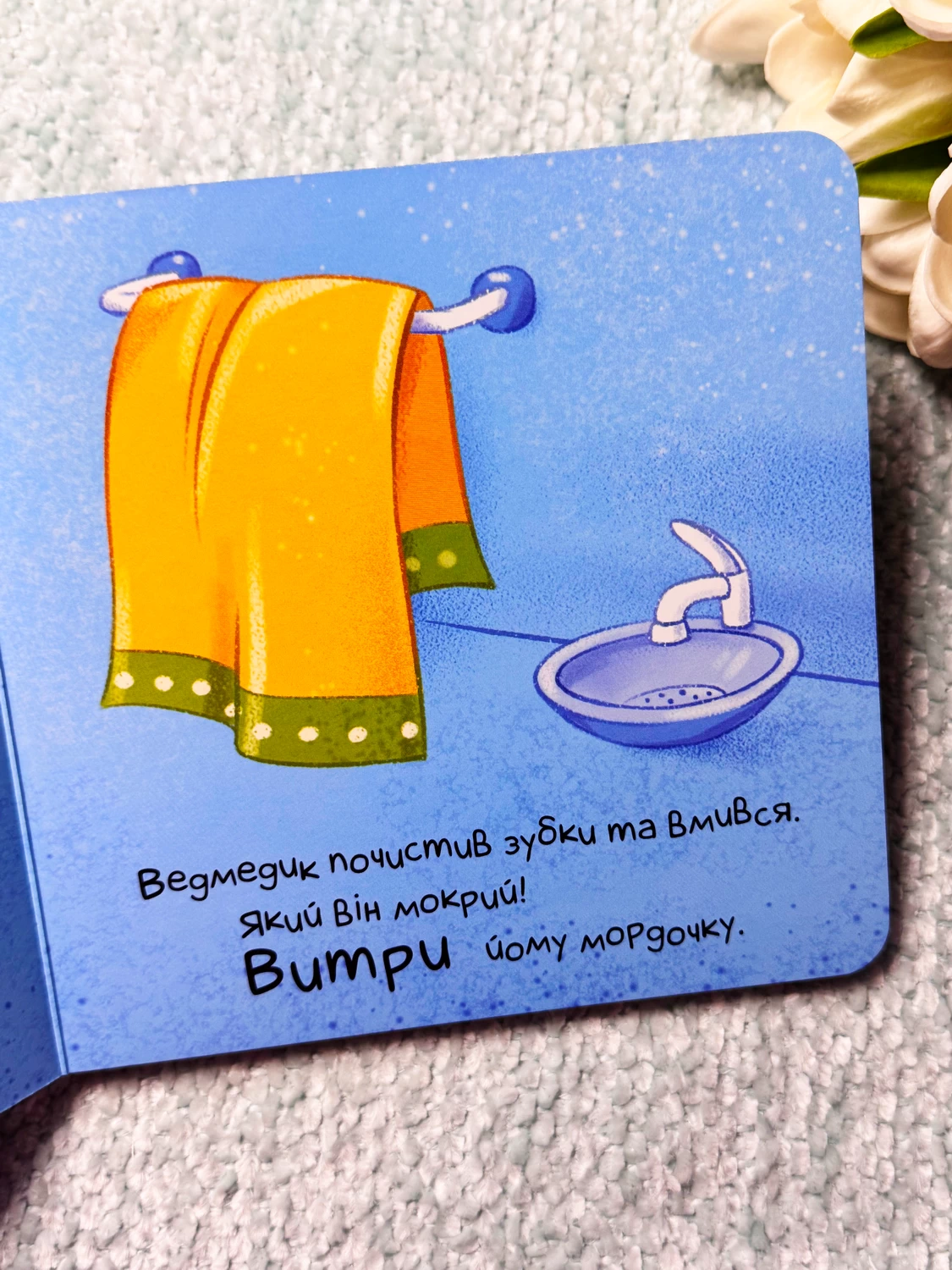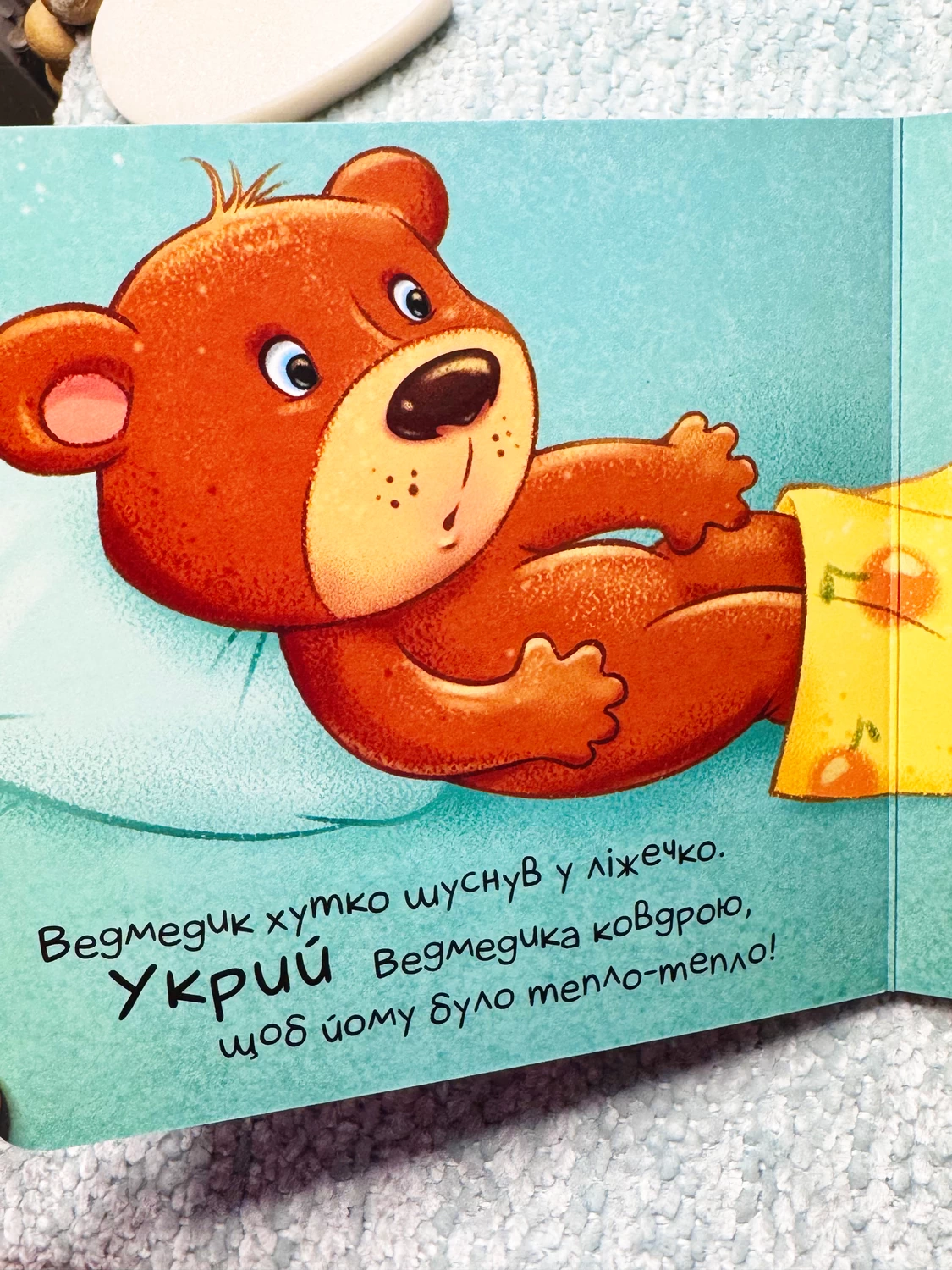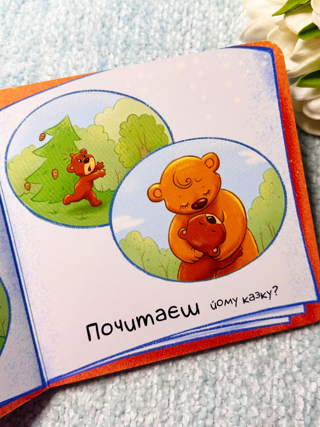 Відповідаємо! Контактну книжку слід не просто читати, з нею потрібно гратися! Дитина братиме активну участь в історії та буде взаємодіяти з головним героєм — ведмедиком. Малюк виконуватиме прості дії, до яких спонукає сюжет: перегортаючи сторінку, накриє ведмедика ковдрою, дивлячись на картинки, «прочитає» ведмедику казку, заколихає, погойдуючи книжку, а потім побажає ведмедику добраніч. Водночас малюк розвиватиме емоційний інтелект, співчуття й впевненість у собі та своїх силах.