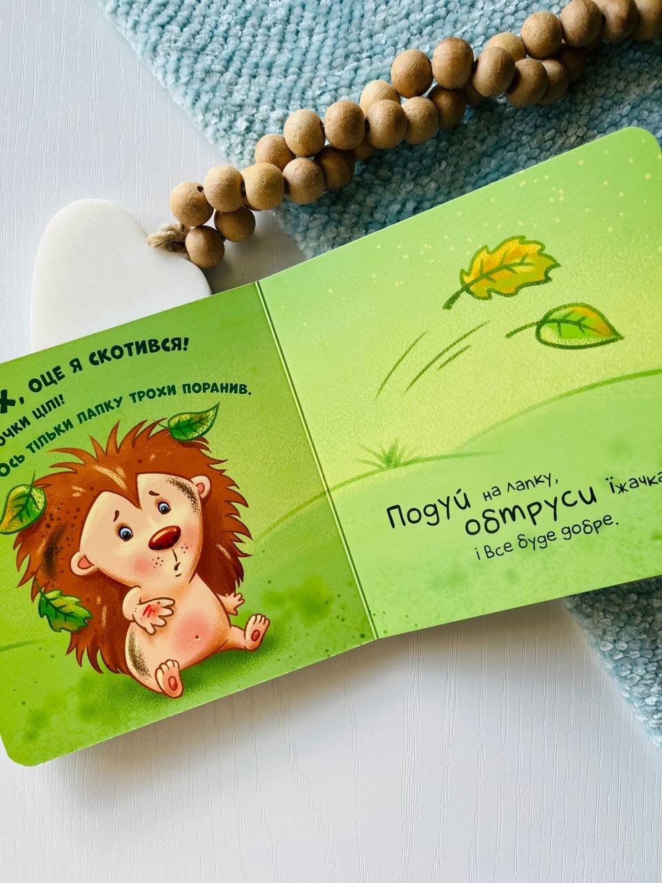 Відповідаємо! Контактну книжку слід не просто читати, з нею потрібно гратися! Дитина братиме активну участь в історії та буде взаємодіяти з головним героєм — їжачком. Малюк виконуватиме прості дії, до яких спонукає сюжет: подмухає на лапку їжачка, щоб йому не було боляче, покрутить книжку, щоб їжачок не скотився з пагорба, перегорне сторінку, відкриваючи двері, потрясе книжку, допомагаючи струсити груші, а потім накриє їжачка долонькою, захищаючи від дощичка. Водночас малюк розвиватиме емоційний інтелект, співчуття й впевненість у собі та своїх силах.