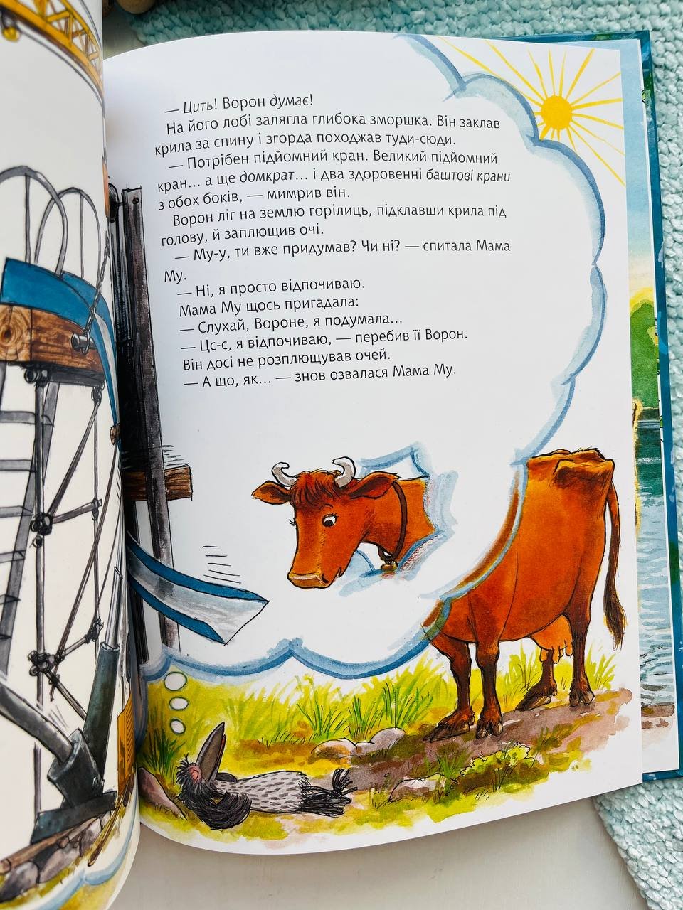 — Але ж дитячу гірку поставили на луці, де пасуться корови. Хіба не так, Вороне? — спитала Мама Му.