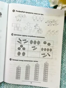 - Завдання для розвитку мислення і моторики: Вправи, які допомагають не лише опанувати математику, а й розвивати уяву, логіку, а також дрібну моторику через малювання та інші активності.