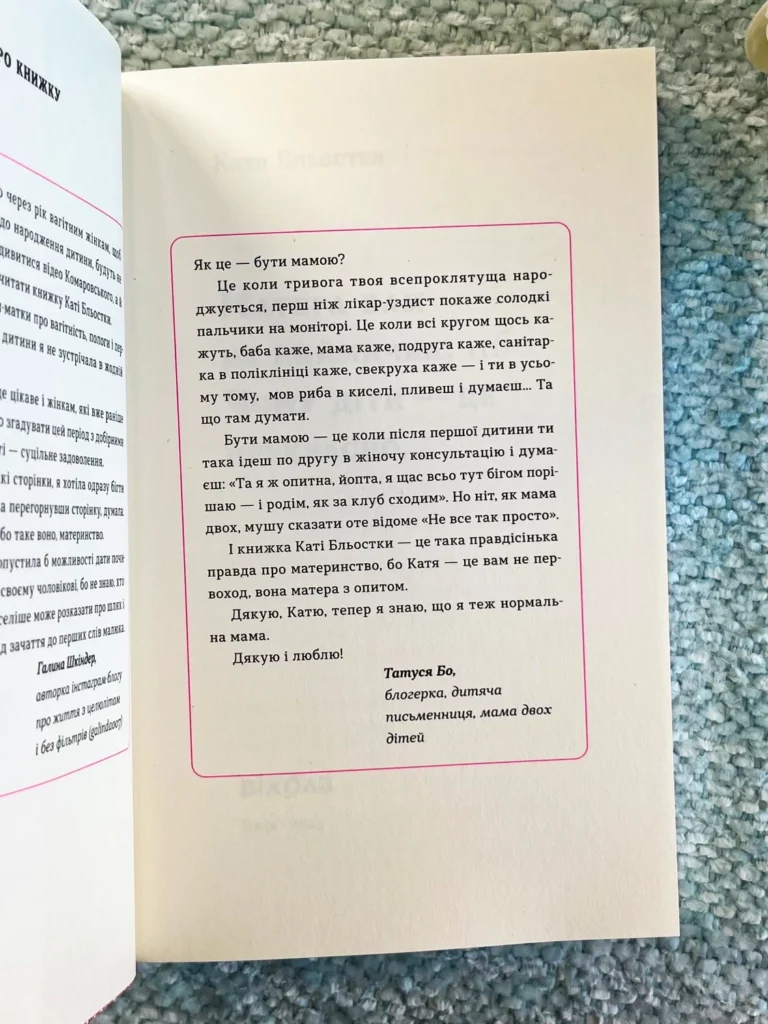 Авторка пропонує глибокий, але водночас легкий погляд на материнство через призму гумору та самоіронії. Книга розповідає про моменти, з якими стикаються мами, — від перших днів вагітності до виховання дітей, що стають маленькими, але дуже важливими частинками її світу. Катя Бльостка не боїться розповідати про труднощі й негаразди, через які проходять батьки, а також про моменти щастя та любові, які приходять разом з дітьми.