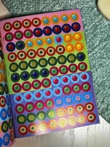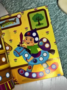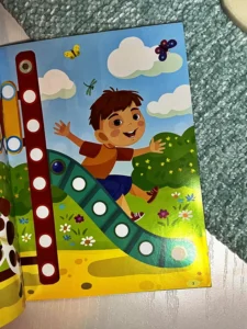 Видання містить 176 наліпок — різнокольорових гаєчок і кнопочок. Дитина має доповнити за їхньою допомогою картинки: вклеїти їх у порожні кружечки за зразком. Колір контура наліпок послугує малюкові підказкою. Робота із цією книжкою сприятиме розвитку в дитини уваги та логіки, дрібної моторики та координації рухів руки, акуратності й творчого мислення.