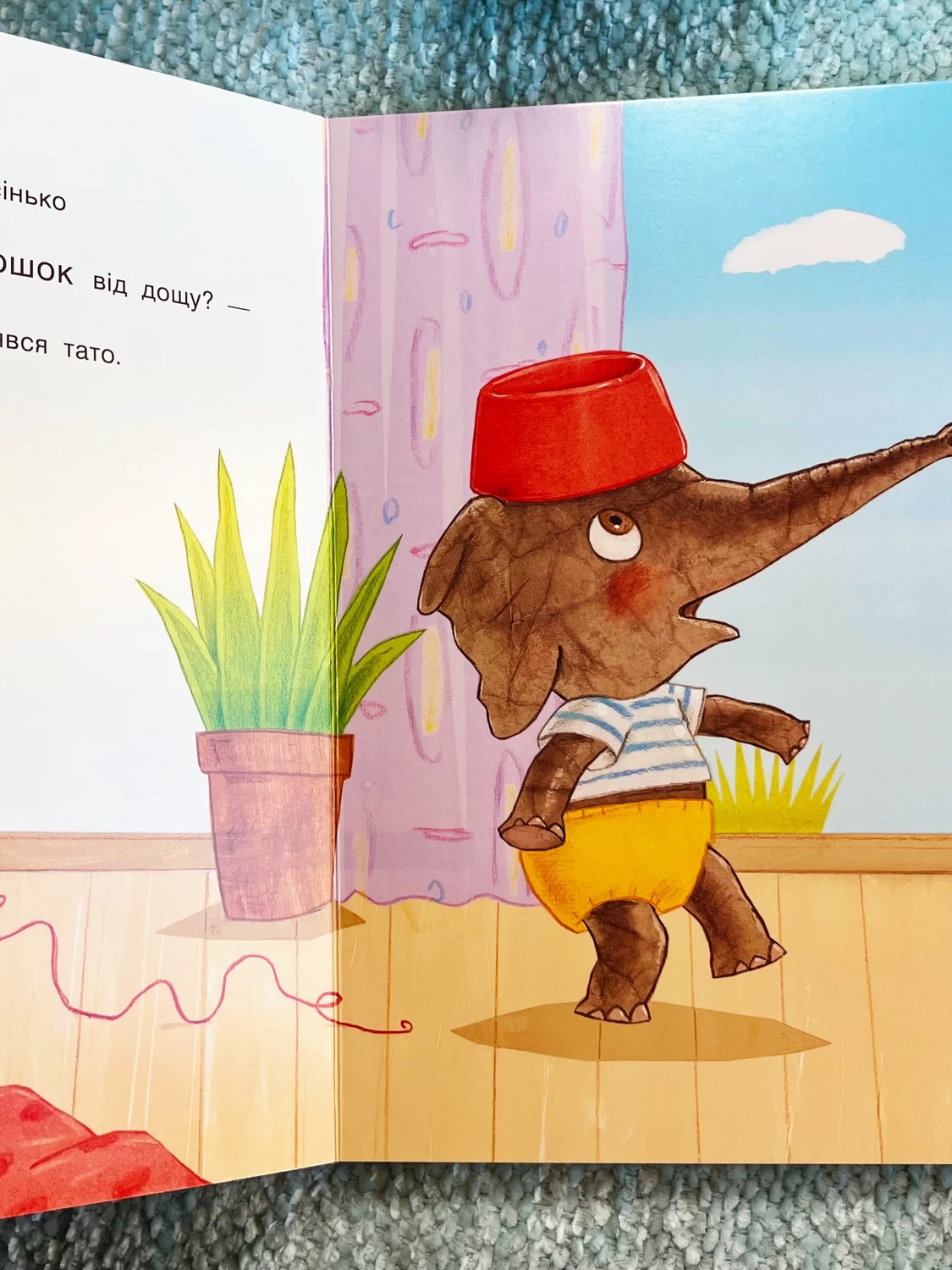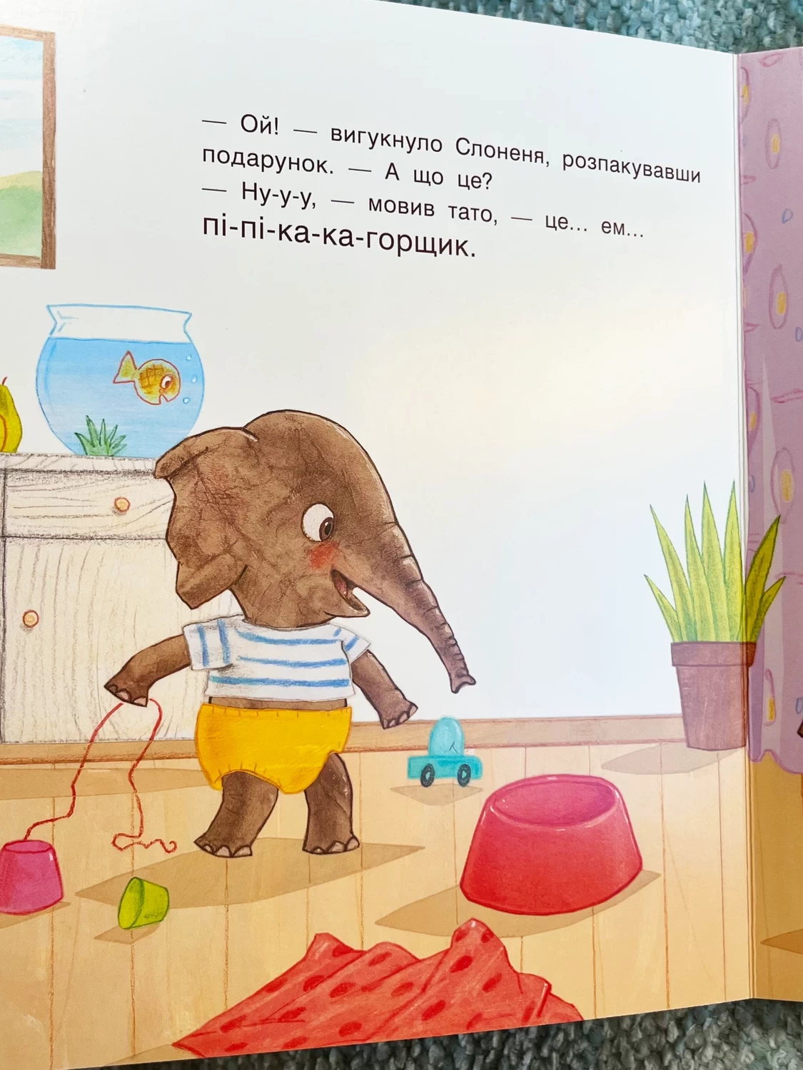 Маленьке Слоненя отримує від своїх батьків цікавий подарунок — новенький горщик. Однак слоненя не може зрозуміти, що з ним робити. Воно пробує використовувати горщик різними способами: носить його як капелюшок від дощу, п’є з нього, як із чашки, і навіть намагається посадити туди свою рибку. Проте справжнє призначення горщика стає зрозумілим тільки тоді, коли тато сідає на нього. Тоді Слоненя нарешті розуміє, для чого цей подарунок насправді призначений.