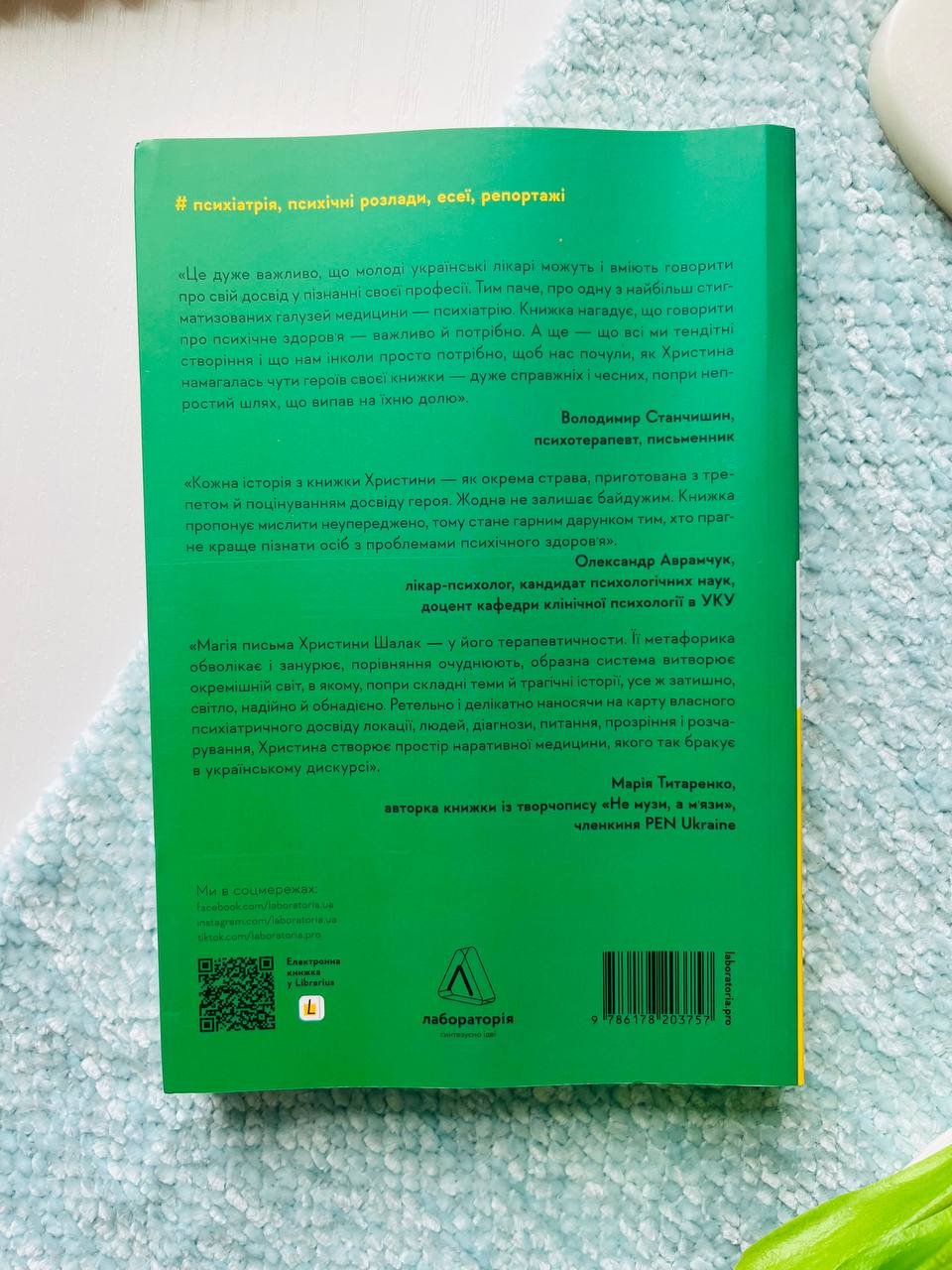 Ця книжка розповідає про психіатрію через призму окремих історій, розказаних самими героями: про те, як жити з тим чи іншим розладом, як лікуватися і працювати у психіатричних лікарнях, як дбати про рідних, які мають психіатричні захворювання. Такі свідчення нерозривно пов’язані з особистостями оповідачів, з їх багатогранними «я» — тож ці історії в першу чергу про людей, а не про хвороби. Ще одна тема, яка виступає тлом і контекстом до поділу — складна і повідомляє історія психіатрії, і зокрема — її відображення в архітектурі, яка стає дзеркалом суспільних і медичних настроїв.