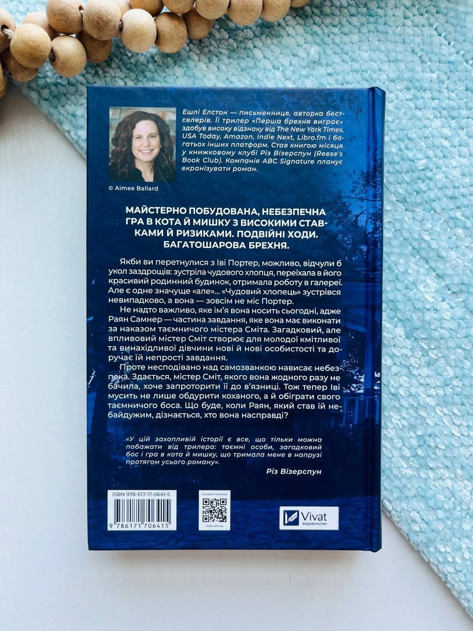 «Перша брехня виграє»Якби ви перетнулися з Іві Портер, можливо, відчули б укол заздрощів: зустріла чудового хлопця, переїхала в його красивий родинний будинок, отримала роботу в галереї. Але є одне значуще «але»… «Чудовий хлопець» зустрівся невипадково, а вона — зовсім не міс Портер. Не надто важливо, яке ім’я вона носить сьогодні, адже Раян Самнер — частина завдання, яке вона має виконати за наказом таємничого містера Сміта. Загадковий, але впливовий містер Сміт створює для молодої кмітливої та винахідливої дівчини нові й нові особистості та доручає їй непрості завдання. Проте несподівано над самозванкою нависає небезпека. Здається, містер Сміт, якого вона жодного разу не бачила, хоче запроторити її до в’язниці. Тож тепер Іві мусить не лише обдурити коханого, а й обіграти свого таємничого боса. Що буде, коли Раян, який став їй небайдужим, дізнається, хто вона насправді?«У цій захопливій історії є все, що тільки можна побажати від трилера: таємні особи, загадковий бос і гра в кота й мишку, що тримала мене в напрузі протягом усього роману», — Різ ВізерспунКріста Вернофф, шоураннерка серіалу «Анатомії Грей», спільно із акторкою і продюсеркою Октавією Спенсер отримали права на екранізацію книги! Фільм має вийти на стримінговому сервісі Hulu, Ешлі Елстон буде залучена до виробицтва як виконавча продюсерка.Вибір книжкового клубу Reese Witherspoon’s Book Club.Обкладинка книжки має цікаву особливість: літери назви світяться у темряві!Детальніше про книгуКнига «Перша брехня виграє» — це психологічний трилер від американської письменниці Ешлі Елстон. У своєму доробку авторка заглиблюється в тонкощі ідентифікації особистості, обману, маніпуляцій та постійної гонитви за виживанням. Секрети Іві Портер здатні її знищити. Зараз вона має все, чого лише можна бажати, але один хибний крок — і бездоганний світ перетвориться на пекло. Головна героїня втратила реальне «Я»: відтак їй байдуже, яке імʼя мати та ким прикидатися. Іві — шахрайка, що виконує накази впливового містера Сміта. Дівчина ніколи не бачила свого наставника, але завжди дотримується його вказівок. Що її спонукає підпорядковуватися чоловіку?Рейтинг 4,02 на Goodreads із понад 519,7 тис. оцінок.Рейтинг 4,3 на Amazon із понад 73 тис. оцінок.Номінація Goodreads Choice Award 2024 у категорії Readers’ Favorite Mystery & Thriller.Загублена між світлом і морокомРоман «Перша брехня виграє» Ешлі Елстон побудований на внутрішньому конфлікті головної героїні, що називає себе міс Портер, хоча це не її справжнє імʼя. Дівчина перебуває в стані моральної амбівалентності. Вона продовжує брати участь в афері та плести витончену павутину з брехні навіть тоді, коли її серце прагне іншого… Іві Портер має романтичні стосунки з бізнесменом Раяном Самнером. Цей чудовий чоловік робить усе, щоб дівчина почувалася щасливою. Він навіть запропонував їй жити разом, однак героїня вважає, що поспішати не варто. Іві починає закохуватися — і це неабияк впливає на її місію… Таємничий містер Сміт дав дівчині завдання: наблизитися до Раяна та завоювати його довіру. Тіні сумнівів переслідують головну героїню, але вона чітко слідує за вказівками свого боса. Відтак Іві копирсається в паперах коханого, досліджує його минуле та спостерігає за Раяном, коли він на роботі. Що чекає на самозванку, коли Самнер дізнається про аферу, чи це ніколи не відбудеться? Дівчина роз