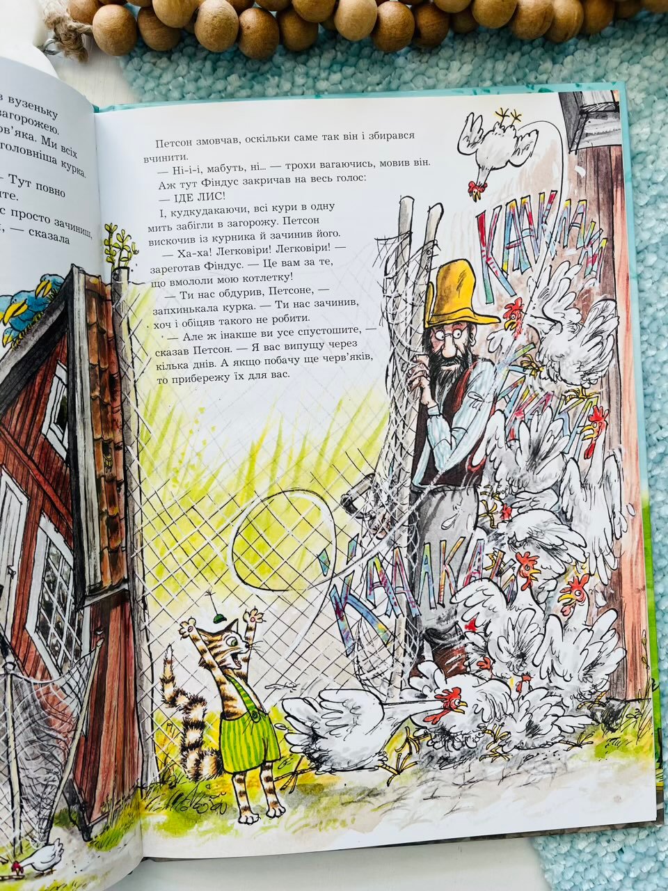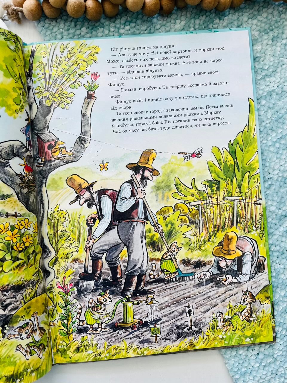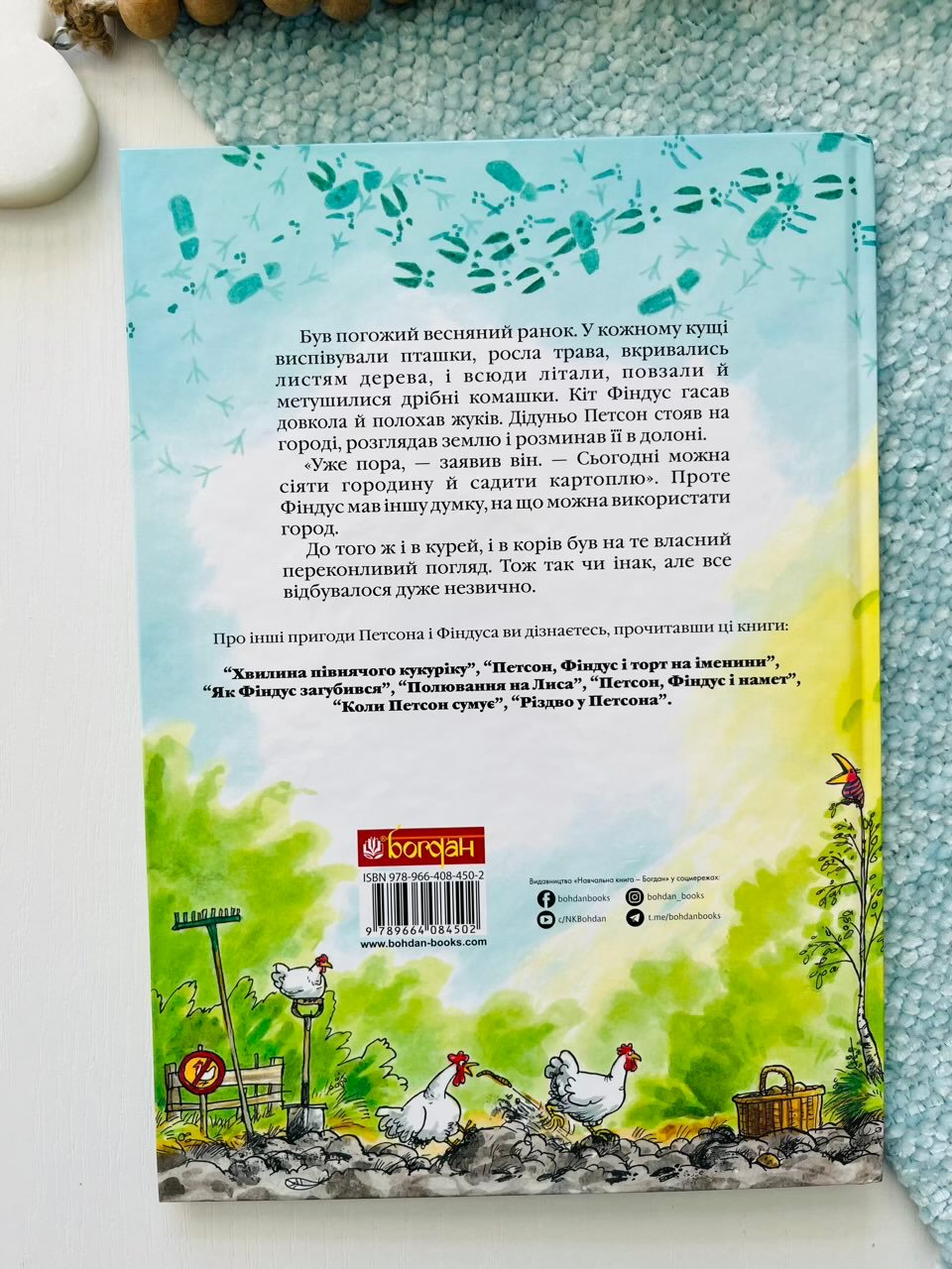 Кіт Фіндус гасав довкола й подохав жуків. Дідуньо Петсон стояв на городі, розглядав землю і розминав її в долоні. «Уже пора, – заявив він. – Сьогодні можна сіяти городину й садити картоплю». Проте Фіндус мав іншу думку, на що можна використати город. До того ж і в курей, і в корів був на те власний переконливий погляд. Тож так чи інак, але все відбувалося дуже незвично.