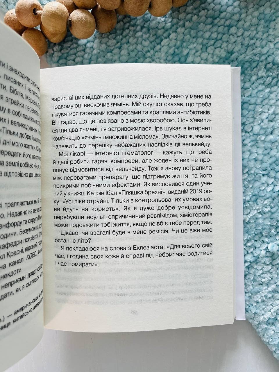 Ця книжка — своєрідний щоденник, який вели Ірвін Ялом та його дружина Мерилін у час найтяжчого випробування: у Мерилін було діагностовано рак, і перед подружжям постало питання, як знайти сенс свого існування у новій реальності, як боротися з відчаєм. Але це не про горе і сум, а про велику любов і життя без жалю. Ірвін і Мерилін Яломи зібрали по крихтах усю мудрість прожитих разом років. Тут немає настанов і мотиваційних порад, а є досвід людей, що навчилися приймати невідворотне і зуміли змиритися з неминучою розлукою. Книжка стане опорою кожному, хто шукає підтримку, розраду й хоче прожити таке життя, про яке не доведеться жалкувати в кінці шляху.
