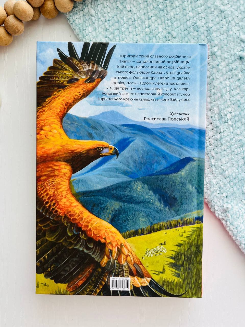 «Пригоди тричі славного розбійника Пинті» — це захопливий розбійницький епос, написаний на основі українського фольклору Карпат. Хтось знайде в повісті Олександра Гавроша далеку історію, хтось — відгомін легенд про опришків, ще третій — несподівану казку. Але карколомний сюжет, неповторний колорит і гумор карпатського краю не залишить нікого байдужим.