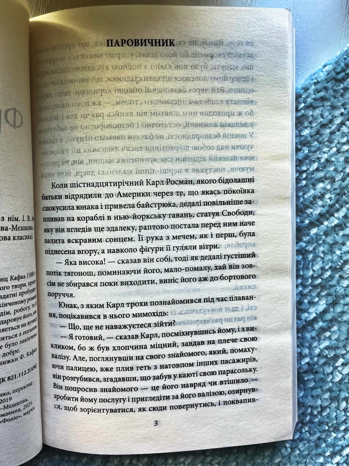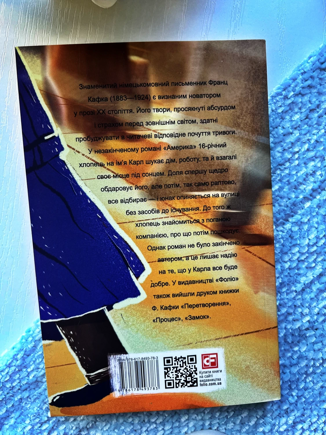 Знаменитий німецькомовний письменник Франц Кафка (1883—1924) є визнаним новатором у прозі XX століття. Його твори, просякнуті абсурдом і страхом перед зовнішнім світом, здатні пробуджувати в читачеві відповідне почуття тривоги. У незакінченому романі «Америка» 16-річний хлопець на ім’я Карл шукає дім, роботу, та й взагалі своє місце під сонцем. Доля спершу щедро обдаровує його, але потім, так само раптово, все відбирає — і юнак опиняється на вулиці без засобів до існування. До того ж хлопець знайомиться з поганою компанією, про що потім пошкодує. Однак роман не було закінчено автором, а це лишає надію на те, що у Карла все буде добре. У видавництві «Фоліо» також вийшли друком книжки Ф. Кафки «Перетворення», «Процес», «Замок».
