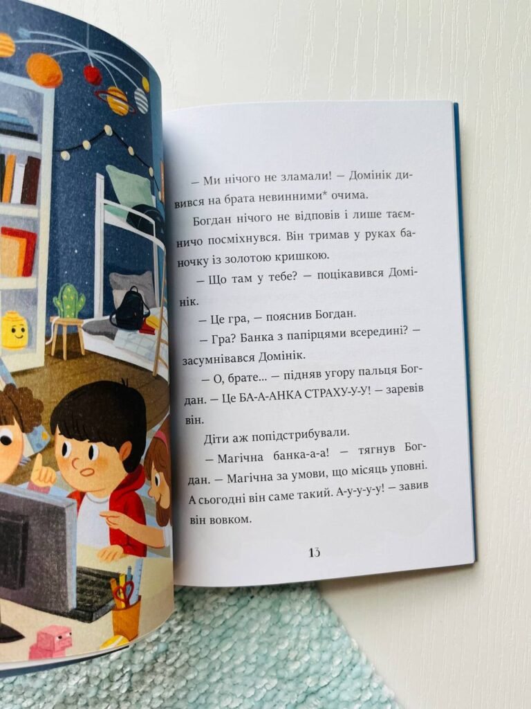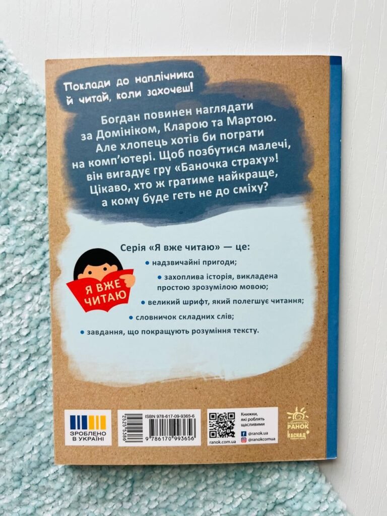 Богдан повинен наглядати за своїм братом Домініком, а ще дівчатками Кларою та Мартою. Але хлопець хотів би пограти на комп’ютері. Щоб позбутися малечі, він вигадує гру «Баночка страху»! Цікаво, хто ж гратиме найкраще, а кому буде геть не до сміху? Прочитайте — і дізнаєтеся! Серія «Я вже читаю» це: надзвичайні пригоди; захоплива історія, викладена простою зрозумілою мовою; великий шрифт, який полегшує читання; словничок складних слів; завдання, що покращують розуміння тексту.