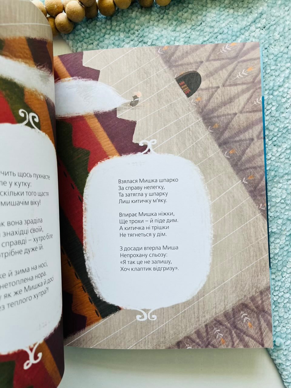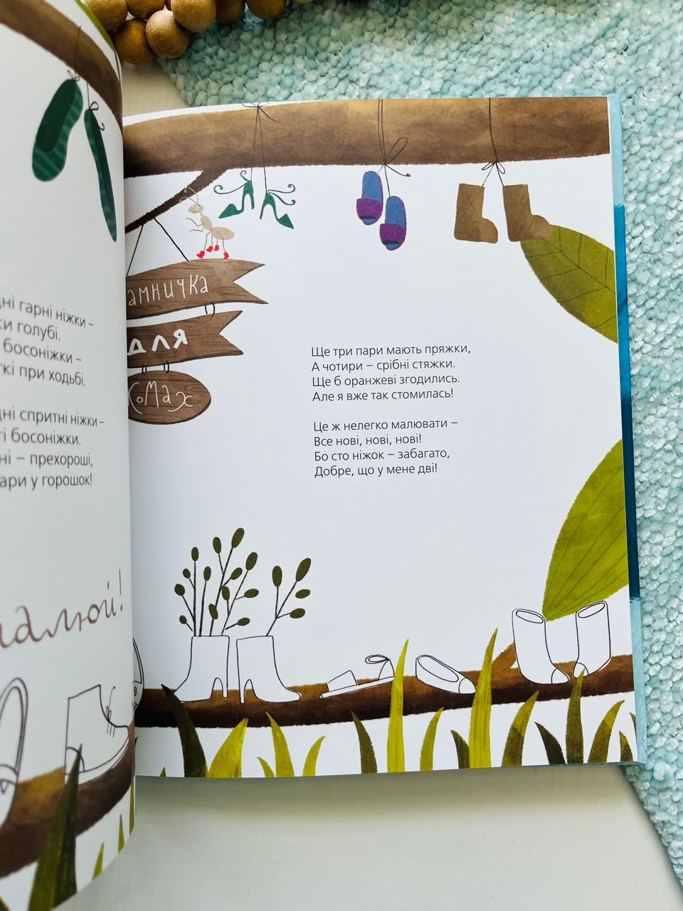 «Босоніжки для стоніжки» мають ще одну «родзинку»: художниця залишила читачам простір для співтворчості, отож вони зможуть розмалювати взуття для стоніжки, і листя на дереві й веселих мишенят.