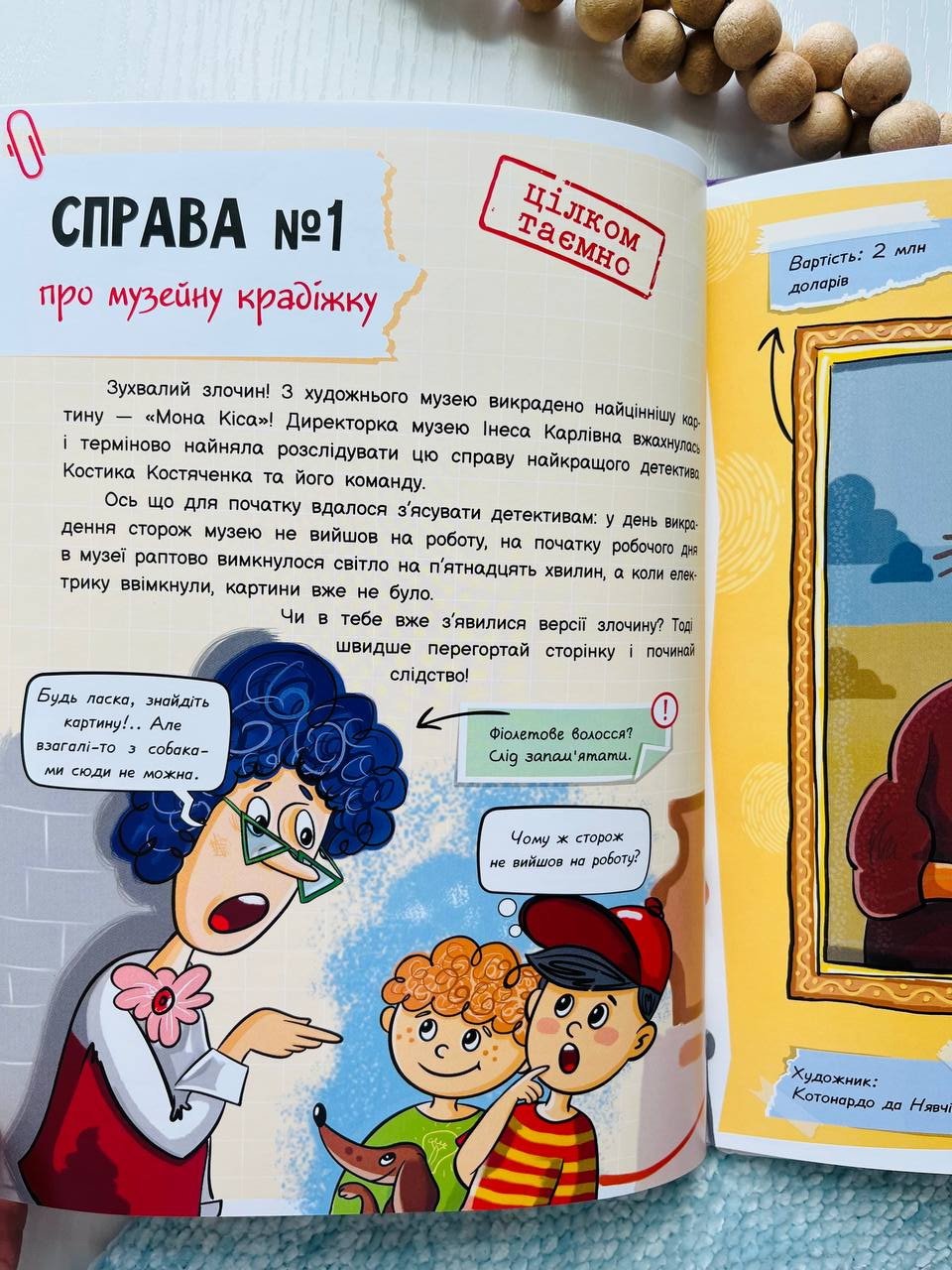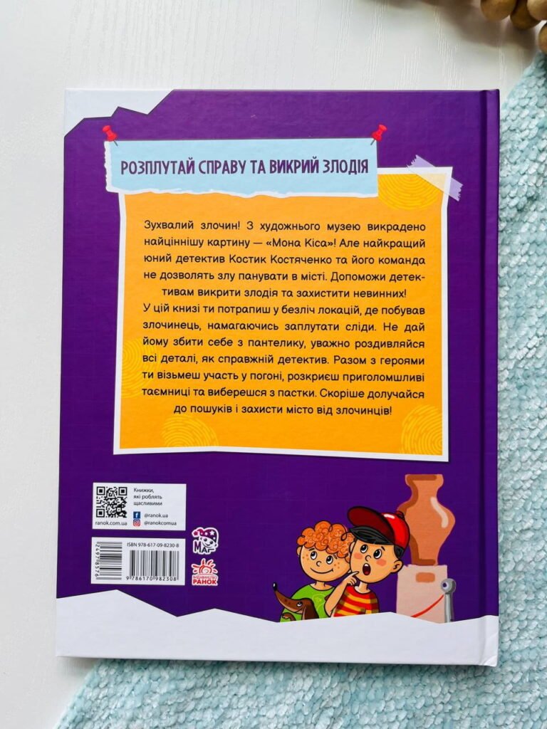 Зухвалий злочин! З художнього музею викрадено найціннішу картину! Але найкращий юний детектив Костик Костяченко зі своєю командою не дозволять злу панувати в місті. Допоможи детективам викрити злодія та захистити невинних. У цій книзі ти потрапиш у безліч локацій, де побував злочинець та намагався заплутати сліди. Не дай йому збити себе з пантелику, будь уважним до усіх деталей, як справжній детектив. Разом з героями ти візьмеш участь у погоні, розкриєш шокуючі таємниці та виберешся з пастки.