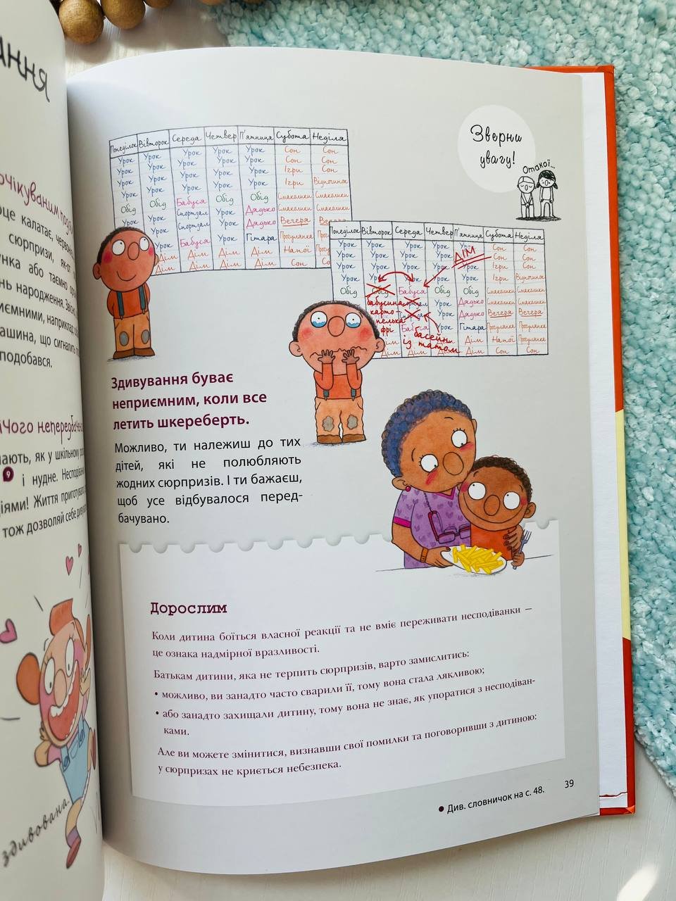 На сторінках читача очікується інформація про 15 найпоширеніших емоцій: гнів, сором, розчарування, огида, ненавість, нудьга, гордість, радість, задоволення, сум тощо. На лівій сторінці книжки йдеться про звичайні й природні емоційні переживання. На правду — чому дитина не в змозі опанувати себе, занадто сильно реагуючи на дрібні з точки зору дорослих події.