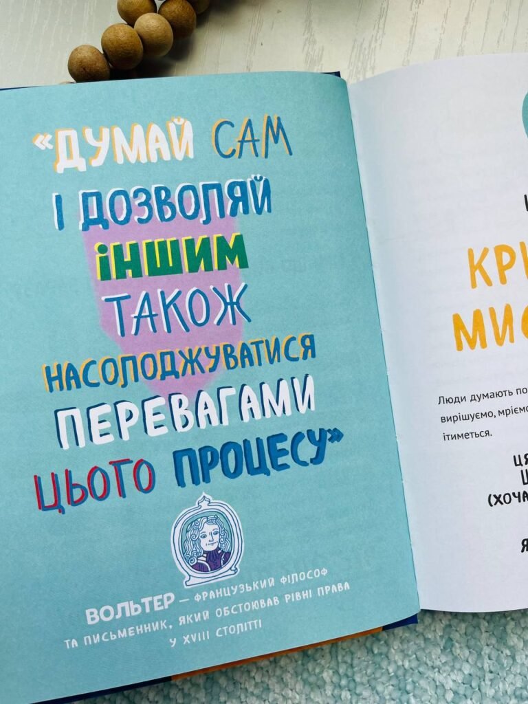 Ця книжка допомагає у виробленні й тренуванні навичок критичного мислення. Вона спонукає запитувати, пізнавати, досліджувати, а не просто брати будь-що на віру. Для досягнення мети потрібно тільки трохи повправлятися з новими «обладунками». А тренування: корисну інформацію, тести для самопізнання, вправи на виявлення обману та цитати для натхнення — знайдеш просто тут.