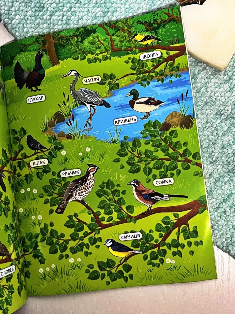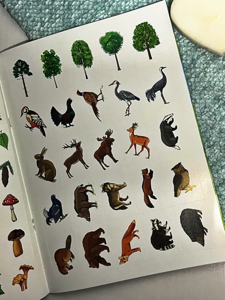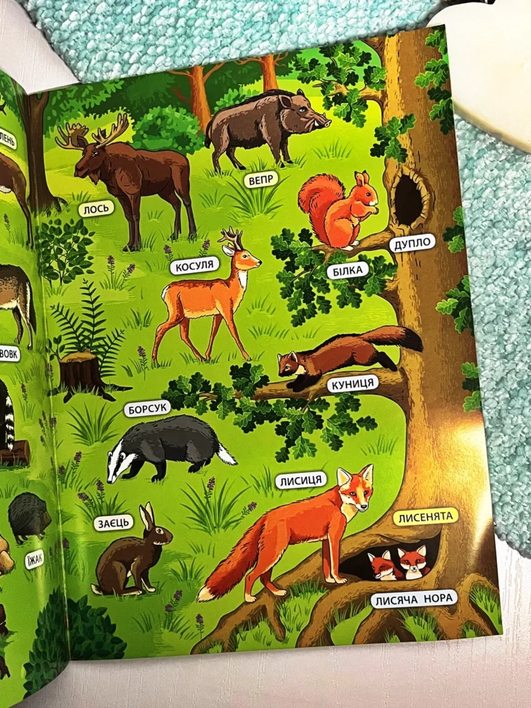 Це видання познайомить дитину зі світом лісу — тваринами, птахами, деревами, ягодами й грибами. У кінці книги малюк знайде захопливу настільну гру, що допоможе весело провести час із друзями, закріпити здобуті знання та пограти з яскравими наліпками, що містяться у виданні.