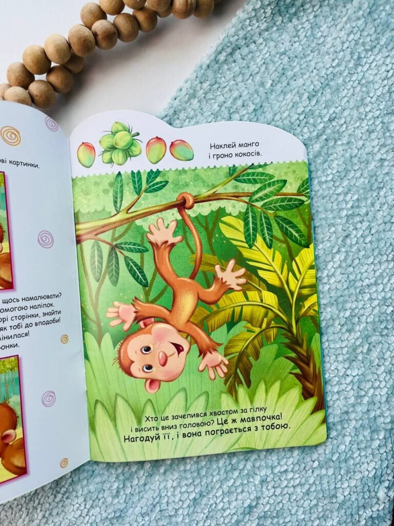 Ваша дитина любить тварин? А наліпки? У книжці вона знайде і те, й інше! Короткі прості сюжети про мавпенятко, великі барвисті наліпки, якими малюк доповнить картинки, — з цією книжкою час промайне цікаво й весело! Завдяки багаторазовим наліпкам дитина може щоразу створювати нову картинку і придумувати свою історію.