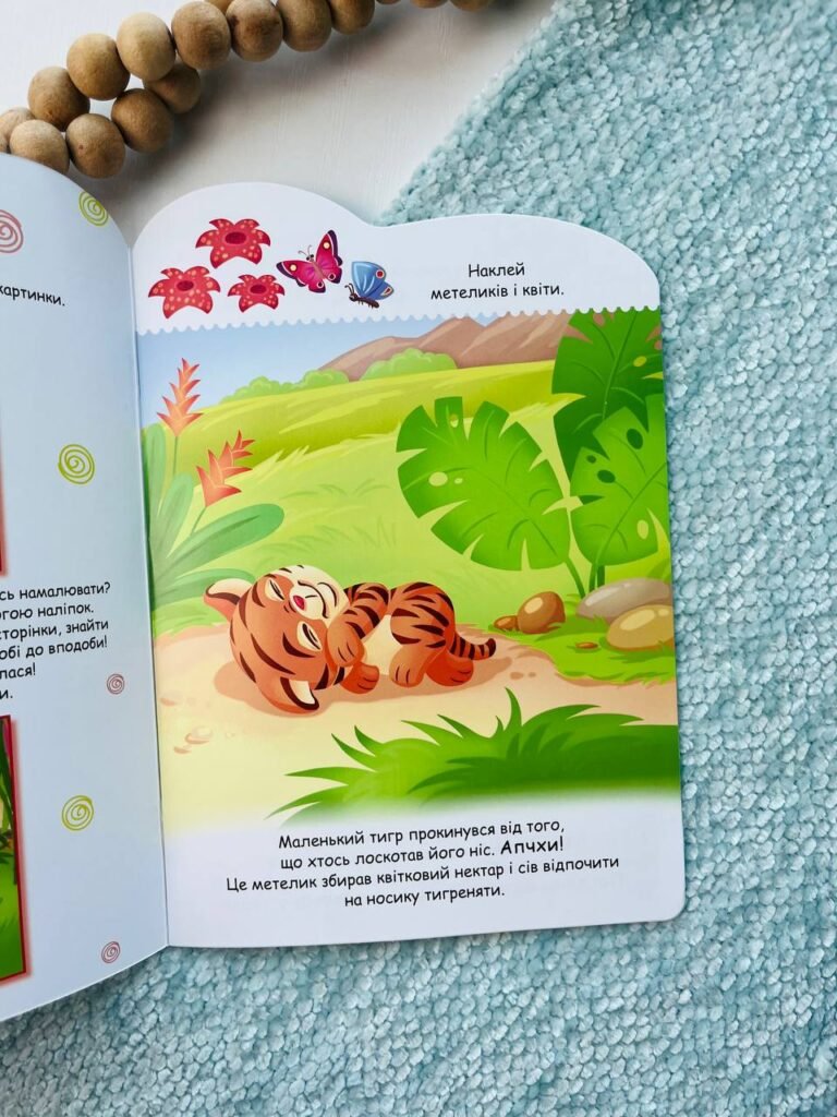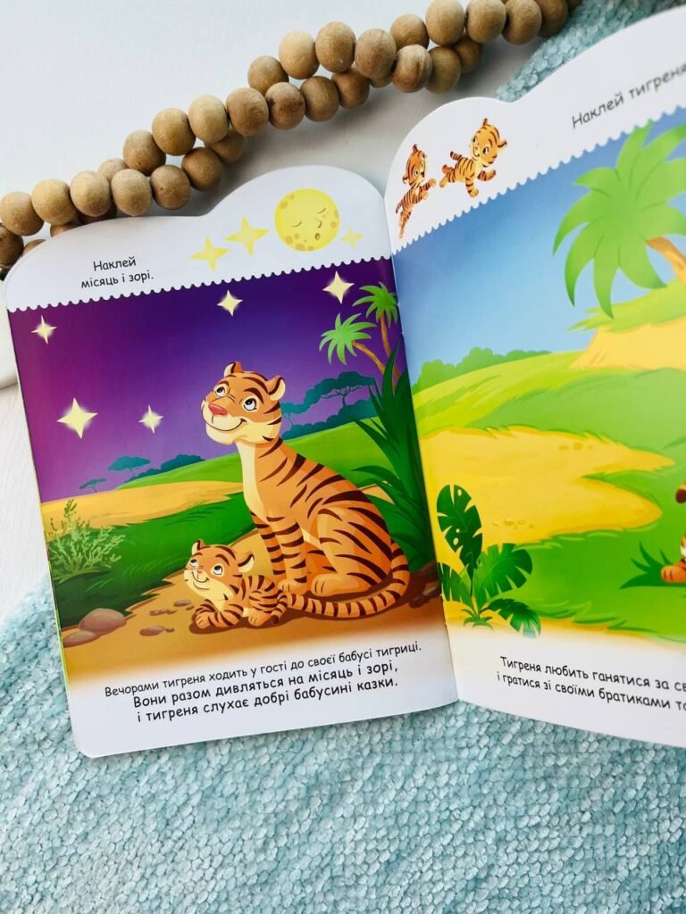 Ваша дитина любить тварин? А наліпки? У книжці вона знайде і те, й інше! Короткі прості сюжети про тигреня, великі барвисті наліпки, якими малюк доповнить картинки, — з цією книжкою час промайне цікаво й весело! Завдяки багаторазовим наліпкам дитина може щоразу створювати нову картинку і придумувати свою історію.