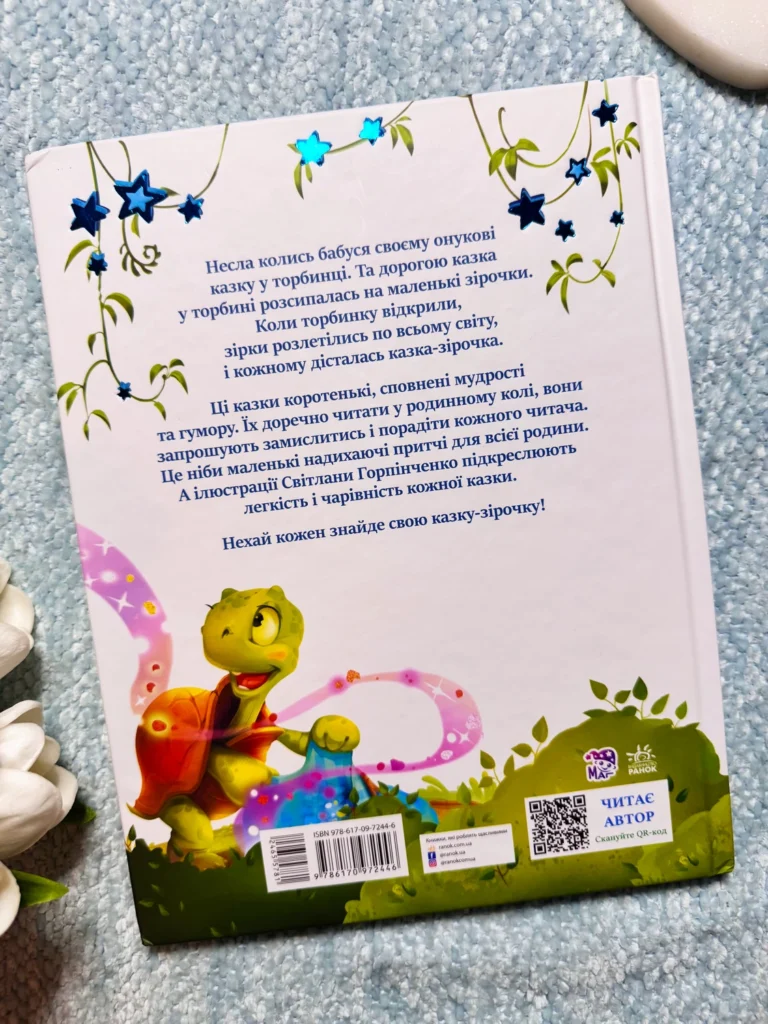 Несла колись бабуся своєму онукові казку у мішечку. Але дорогою казка в сумці розсипалася на маленькі зірочки. Коли сумку відкрили, зірки розлетілися по всьому світу, і кожному дісталася казка-зірочка. Ці казки коротенькі, сповнені мудрості та гумору. Їх доречно читати у колі сім’ї, вони запрошують замислитися та порадіти кожному читачеві. Це як маленькі надихаючі причини для всієї родини. А ілюстрації Світлани Горпинченко наголошують на легкості та чарівності кожної казки. Нехай кожен знайде свою казку-зірочку!