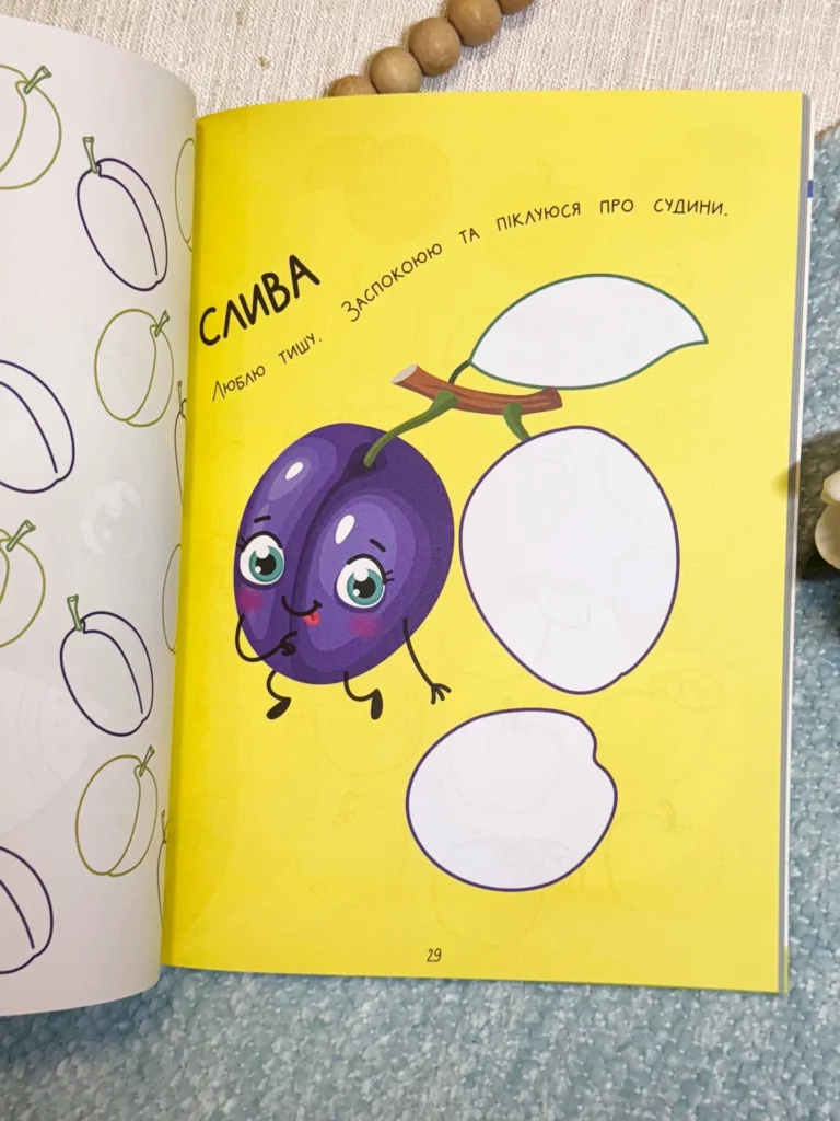 В цьому збірнику малюк знайде не лише аплікації, а й різноманітні патерни та цікаві факти про овочі й фрукти, що допоможуть збагачувати словниковий запас і піднімати настрій. Дитина зможе створювати аплікації у 2D форматі, що сприятиме розвитку таких важливих навичок, як робота з ножицями і клеєм.