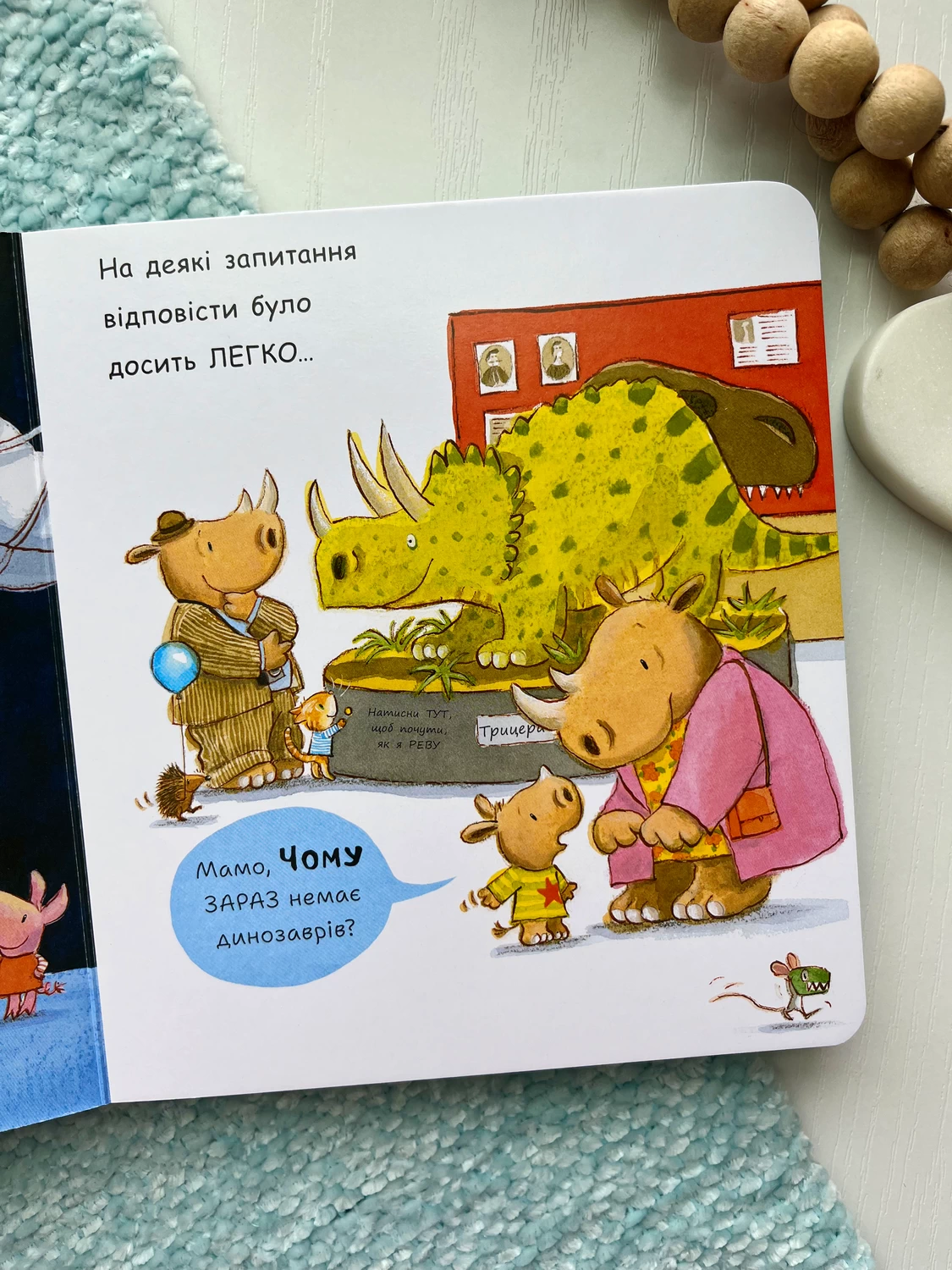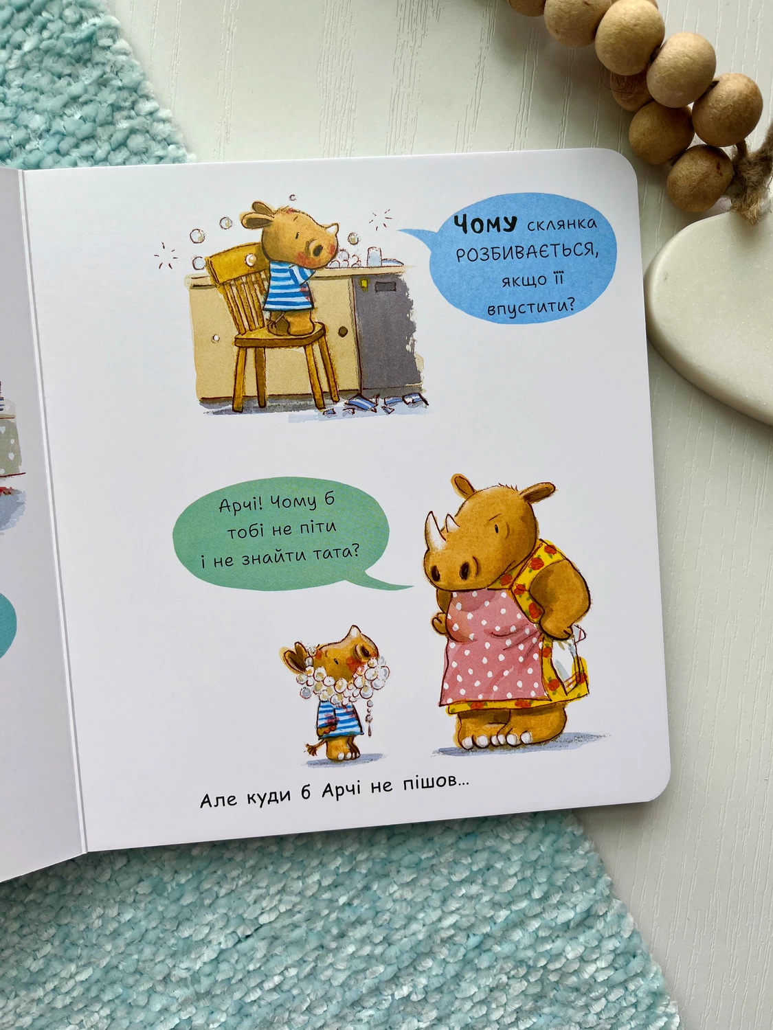 Скільки запитань на день ставить вам ваш малюк? У маленького носорога Арчі їх сила-силенна! Чому бруд такий липкий? Чому склянка розбивається, якщо її впустити? Чому з хліба сиплються крихти? Опинившись у музеї, Арчі ставить удвічі більше запитань. І на всі їх, звісно, мають відповісти батьки. Як добре, що малюк іноді спить.