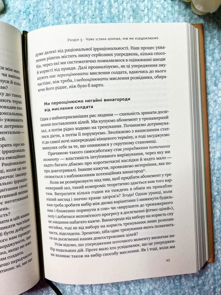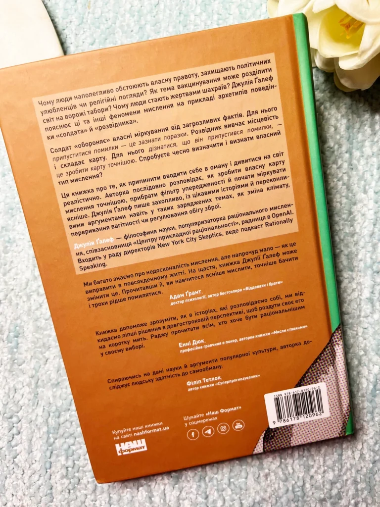 Чому люди наполегливо обстоюють власну правоту, захищають політичних улюбленців чи релігійні погляди? Як тема вакцинування може розділити світ на ворожі табори? Чому люди стають жертвами фінансових пірамід, а іншим вдається вирватися зі структури? Джулія Ґалеф пояснює ці й інші феномени мислення на прикладі поведінки солдата й розвідника. Солдат обороняє власні міркування від загрозливих фактів. Для нього припуститися помилки — це зазнати поразки. Розвідник вивчає місцевість і складає карту. Для нього дізнатися, що він припустився помилки, — це зробити карту точнішою.