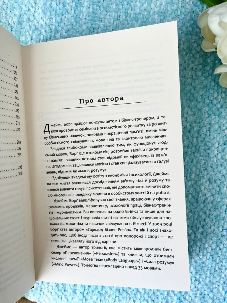 Бізнес-тренер Джеймс Борґ, відомий своїми відкриттями в галузях спілкування, особистісного розвитку, мови тіла та «контролю мислення», пропонує прості і дієві поради для кожної людини. Його методика допоможе змінити спосіб мислення і поведінку в особистому житті й на роботі, зробить життя цікавішим, насиченішим і позбавить зайвого стресу, а ваші навички спілкування сягнуть геть нового рівня.