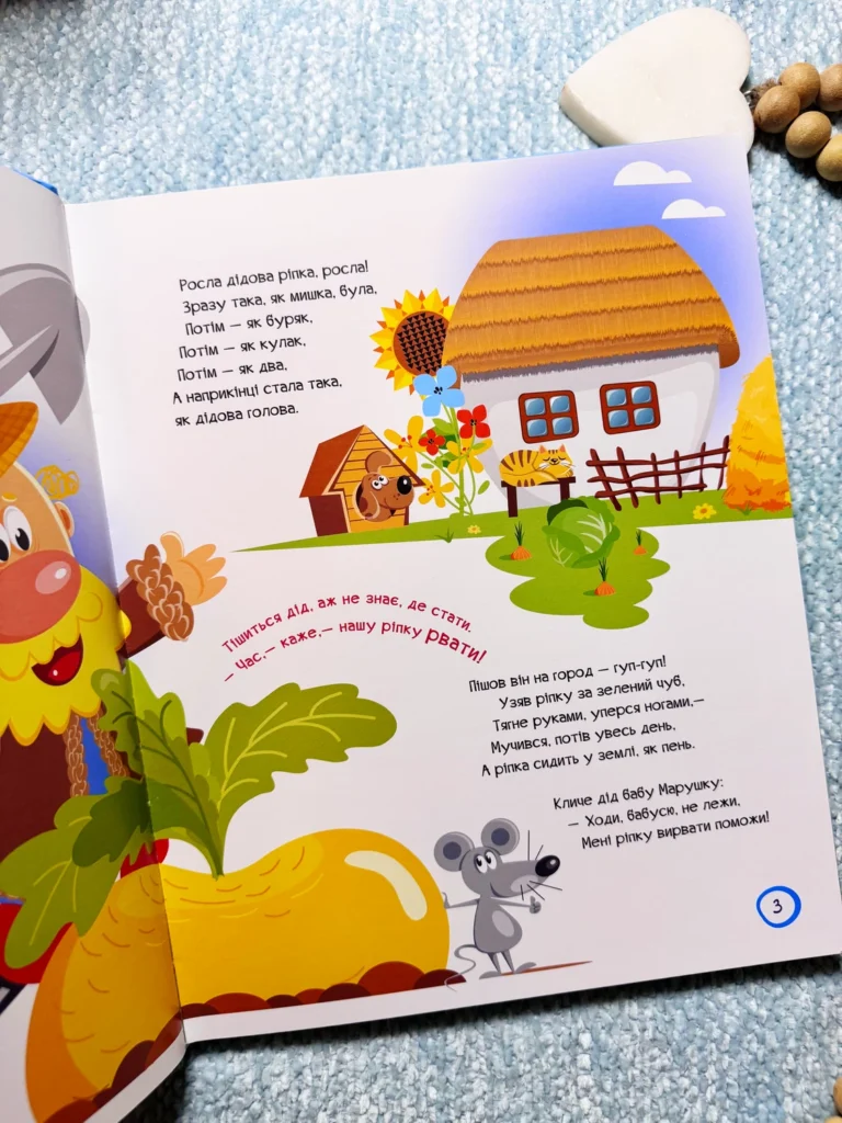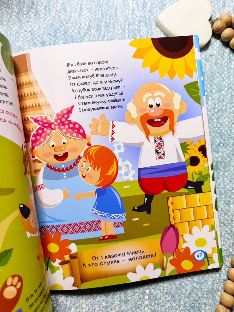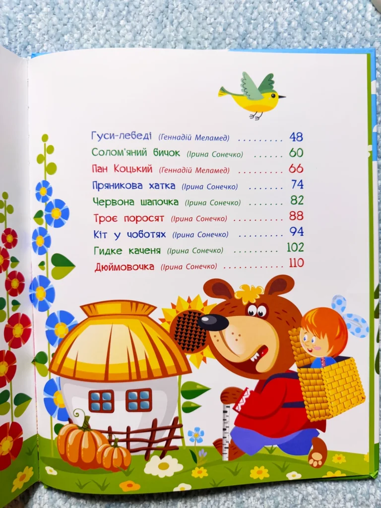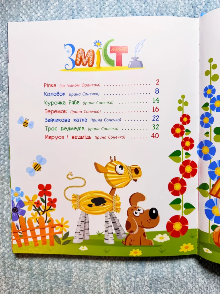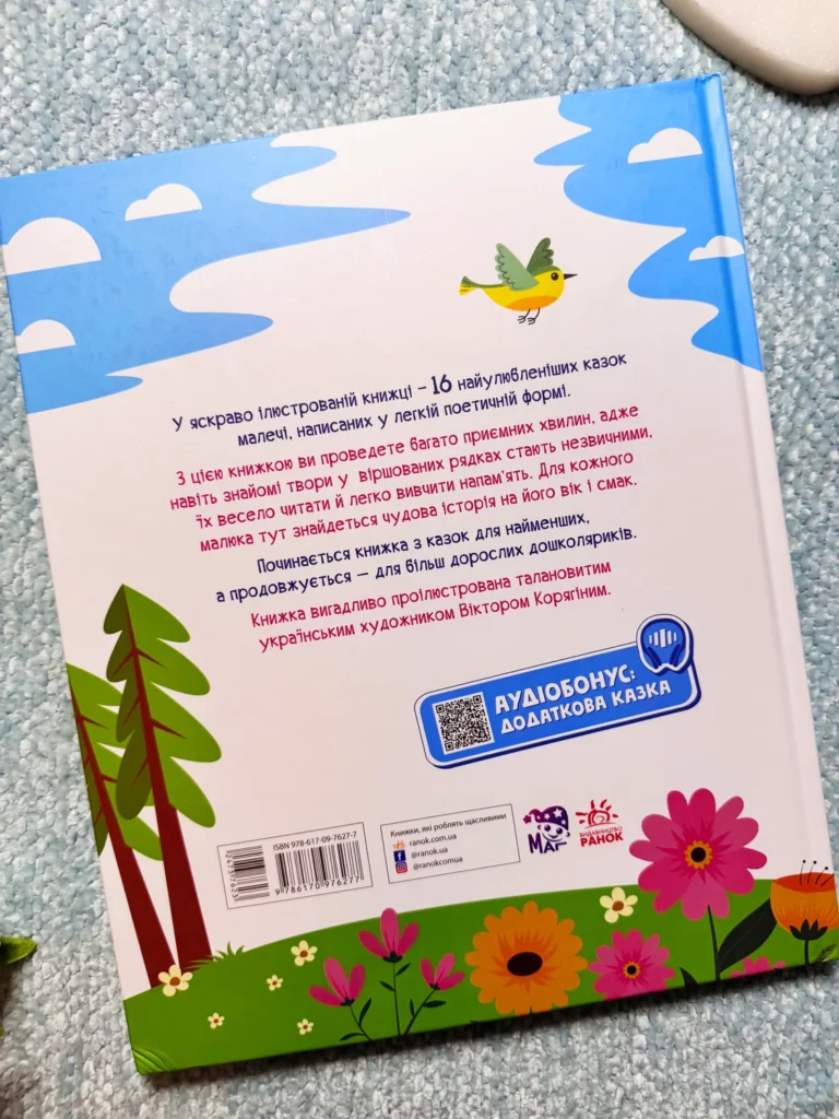 У яскраво ілюстрованій книжці — 16 найулюбленіших казок малечі, написаних у легкій поетичній формі. З цією книжкою ви проведете багато приємних хвилин, адже навіть знайомі твори у віршованих рядках стають незвичними, їх весело читати й легко вивчити напам’ять. Для кожного малюка тут знайдеться чудова історія на його вік і смак.