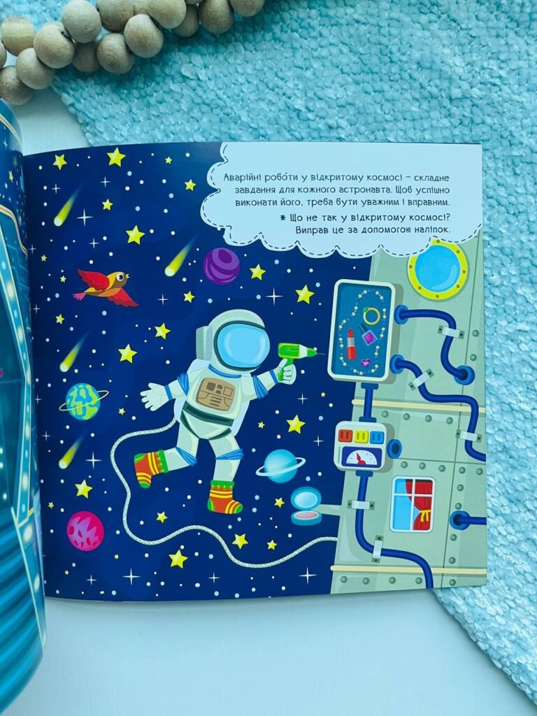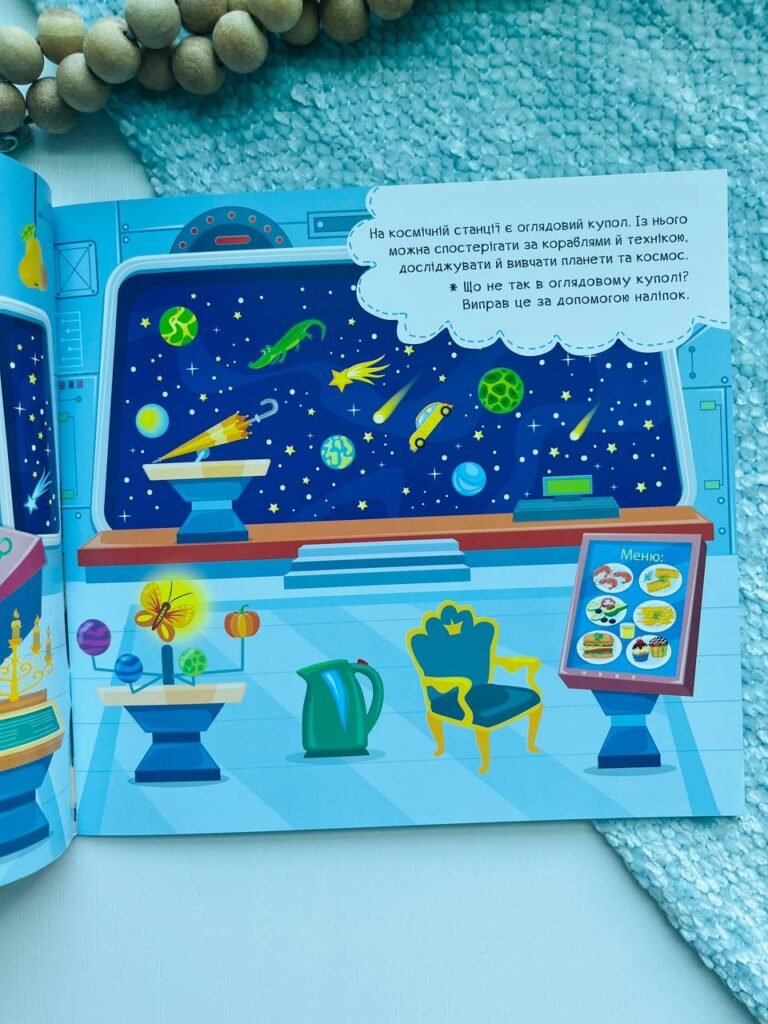 Дітям так подобається шукати та знаходити помилки на картинках. А виправляти їх за допомогою яскравих наліпок — це подвійне задоволення! На кожній сторінці серії «Наліпки-помічниці» діти матимуть змогу:— уважно розглянути картинку;— з’ясувати, що на ній не так;— виправити неточності за допомогою наліпок;— дізнатися цікаву інформацію та творчо її доповнити.Ця книжка допоможе дітям потрапити на космічну станцію: зазирнути в центр управління кораблем й оглядовий купол, у наукову лабораторію й шлюз для виходу в космос, провести ремонтні роботи у відкритому космосі й узяти участь у науковій космічній експедиції. Захопливі завдання допоможуть розвинути увагу, логічне мислення, уяву та мовлення, а оригінальне оформлення у вигляді смішної плутанини неодмінно зацікавить дитину. Видання сприятиме розвитку уваги, логічного мислення, уяви та мовлення, а також дозволить весело й пізнавально провести час.
