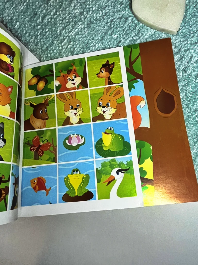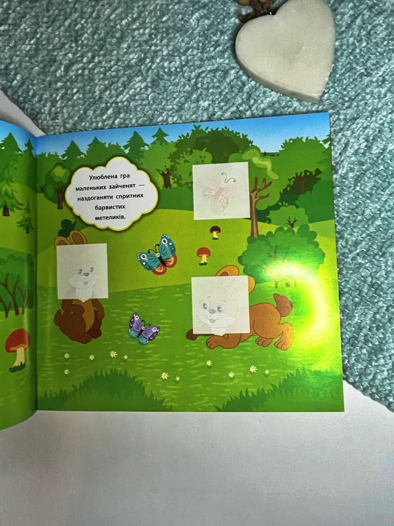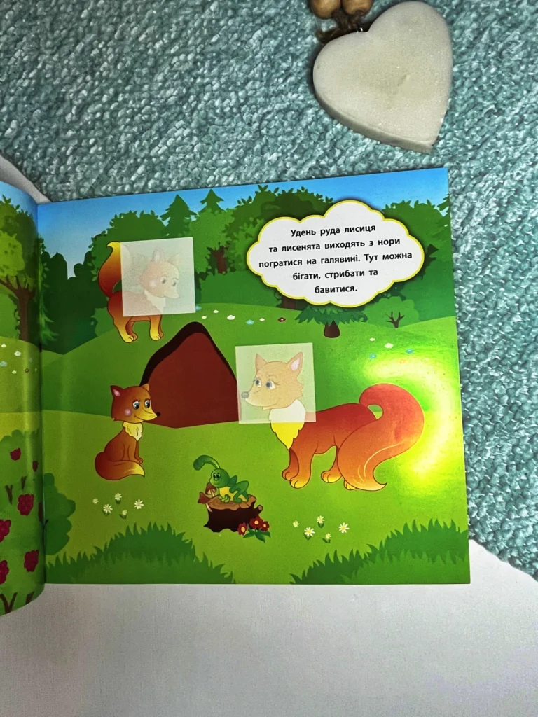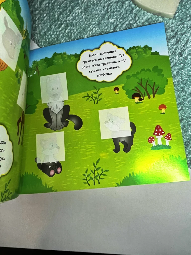 Ця книга познайомить дітей з багатьма мешканцями лісу: лисичкою, вовком, оленем, зайчиком, їжаком та іншими. Також видання навчить малюків розрізняти поняття цілого та його частини. За допомогою фрагментів-наліпок дитина зможе доповнювати яскраві картинки, а короткі розповіді на кожній сторінці допоможуть батькам зацікавити малюка й стануть гарним поштовхом до створення власних історій. Книга сприятиме розвитку логічного мислення, фантазії, мовлення, уваги та дрібної моторики пальців рук.