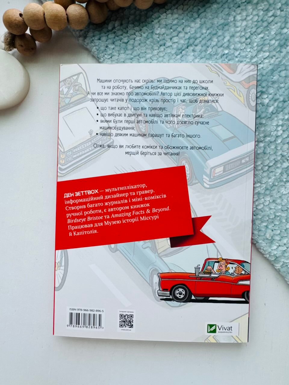 Машини оточуютъ нас скрізъ: ми їздимо на них до школи та на роботу, бачимо на будмайданчиках та перегонах. А чи все ми знаємо про автомобілі? Автор цієї дивовижної книжки запрошує читачів у подорож крізь простір і час, щоб дізнатися:• що таке капот і що він приховує;• що вибухає в двигуні та навіщо автівкам електрика;• якими були перші автомобілі та чого досягло сучасне машинобудування;• навіщо деяким машинам парашут та багато іншого. Отже, якщо ви любите комікси та обожнюєте автомобілі, мерщій берітъся за читання!