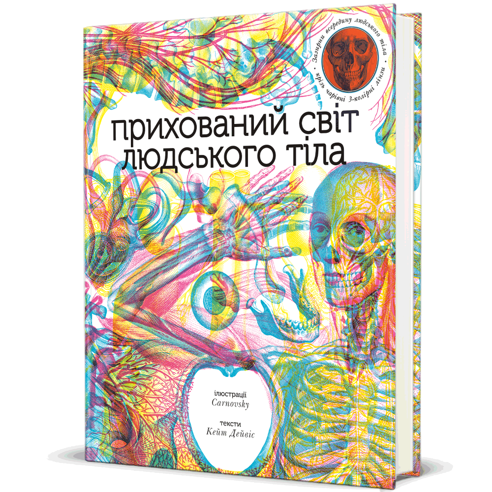Але все це можна прочитати і побачити тільки за допомогою спеціальних лінз. Через червону лінзу читач зможе вивчати скелет людини, через зелену – дізнатися все про людські м’язи, а через синю – побачити всі внутрішні органи. Це пізнавальне та інтерактивне видання – не лише про будову тіла, а й про роботу всіх його систем. І ця наукова інформація подана у таких спосіб, щоб зацікавити дитинучитати науково-популярні книжки і пізнавати цей світ.