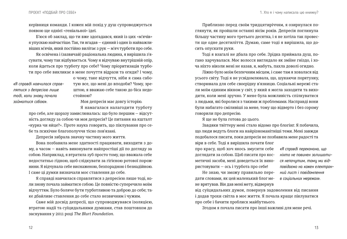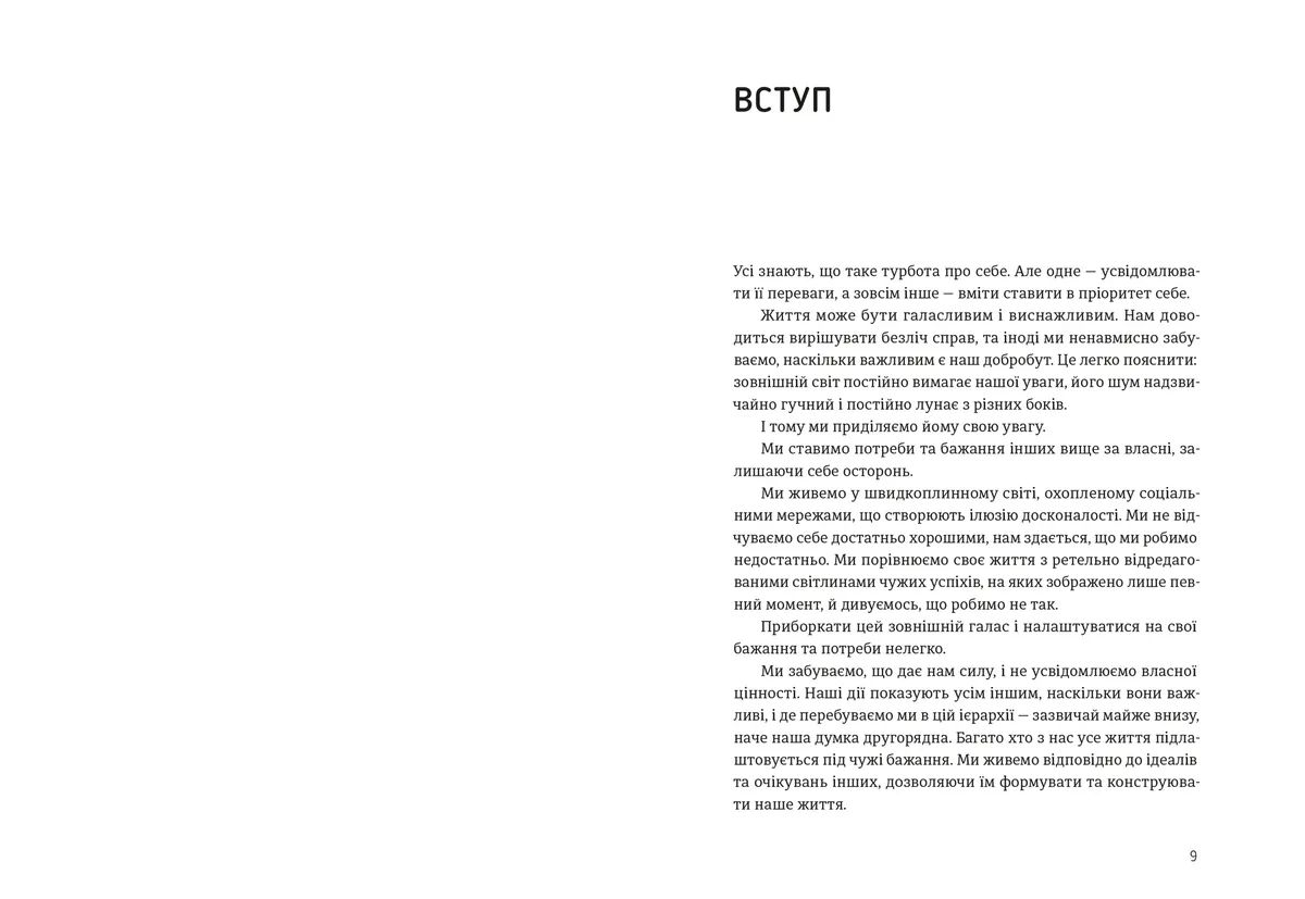 Ця книга — щире нагадування про те, що турбота про себе починається з маленьких кроків: доброго слова до себе, моменту тиші, усвідомленого «так» власним потребам. Авторка простою і зрозумілою мовою розповідає, як виховати здорове ставлення до себе, звільнитися від надмірних очікувань, зменшити самокритику та повернути собі відчуття власної цінності.
