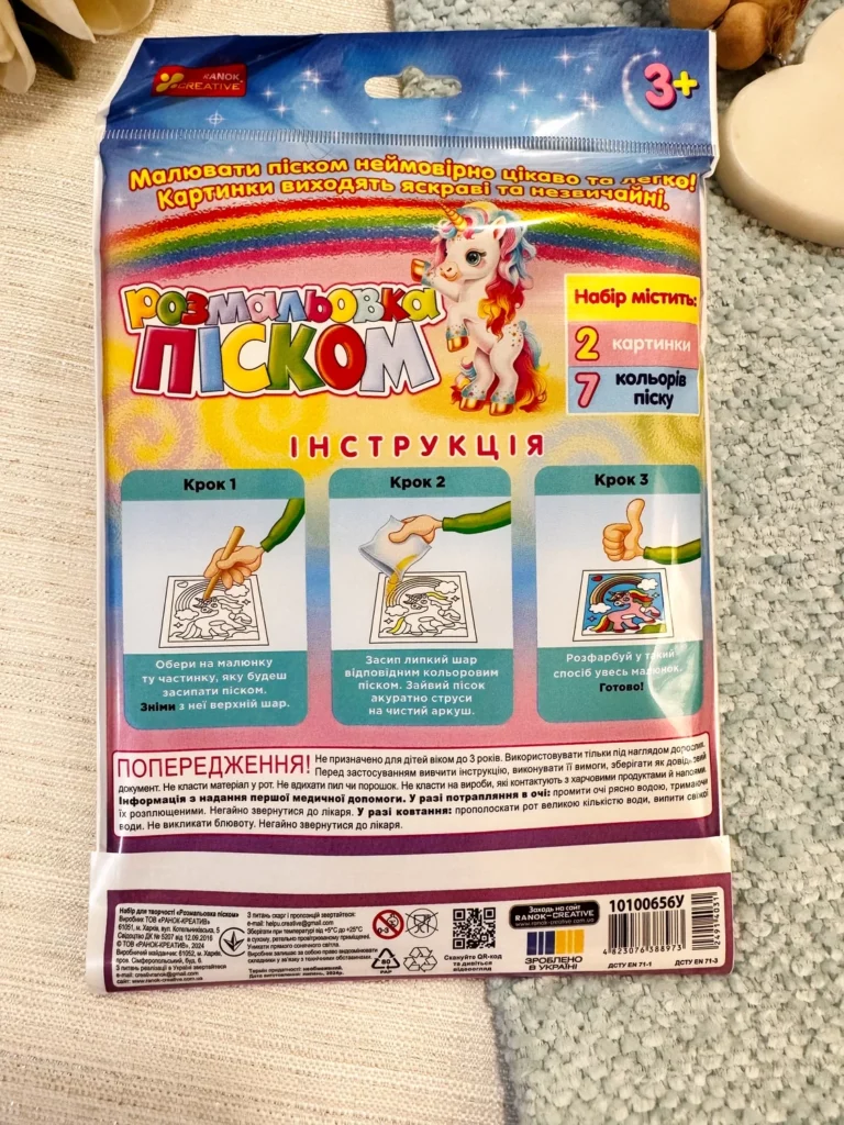 Творче заняття для малечі: розфарбовуємо картинку кольоровим піском! Діти можуть декорувати малюнок за шаблоном, як на зображенні, або проявити свою фантазію та зробити це на свій смак. Такий вид творчості дуже подобається дошкільнятам і сприяє розвитку дрібної моторики та уяви. Кожен колір піску окремо запакований у герметичне упакування, що забезпечує зручність у використанні.