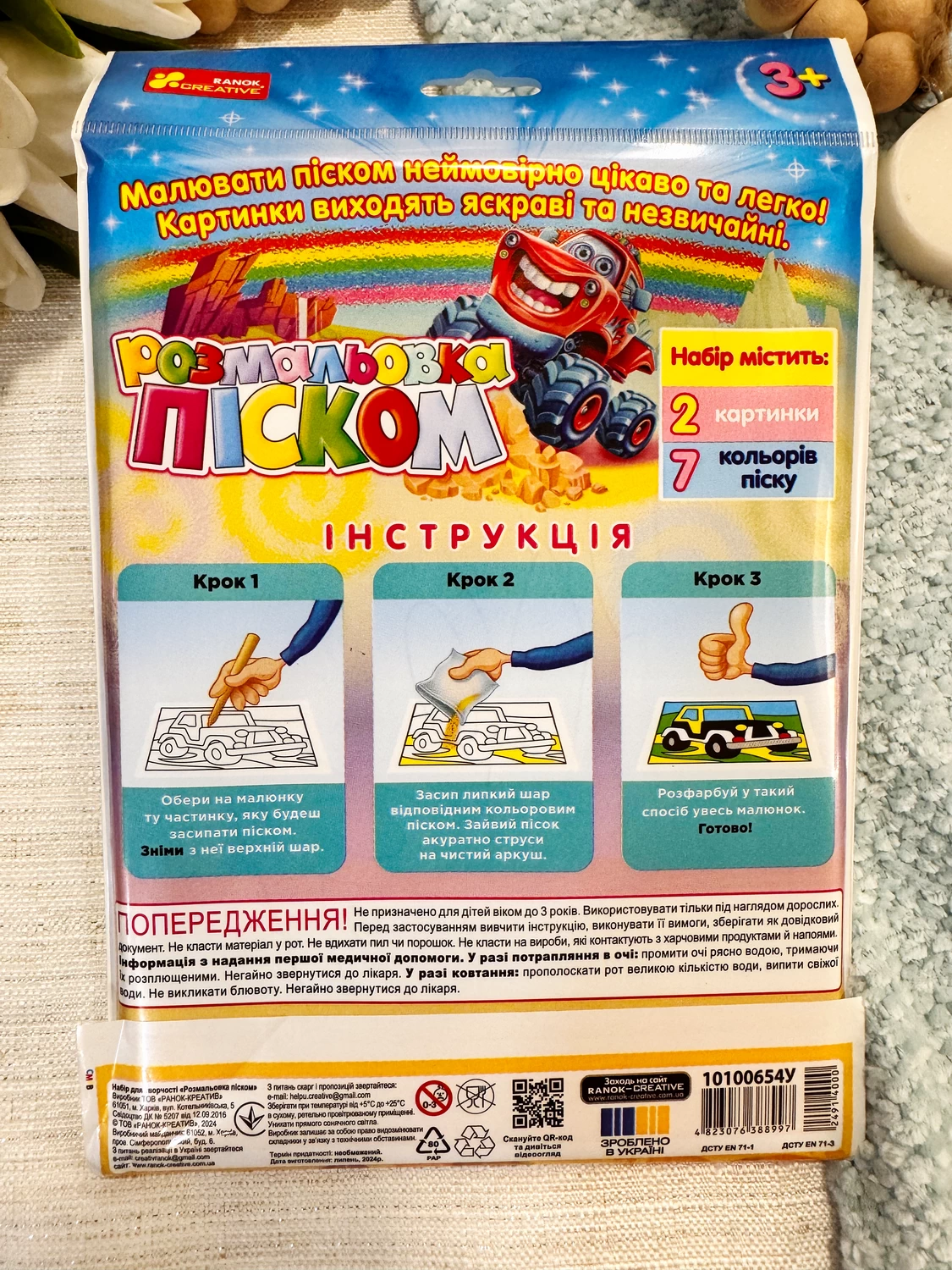 Творче заняття для малечі: розфарбовуємо картинку кольоровим піском! Діти можуть декорувати малюнок за шаблоном, як на зображенні, або проявити свою фантазію та зробити це на свій смак. Такий вид творчості дуже подобається дошкільнятам і сприяє розвитку дрібної моторики та уяви. Кожен колір піску окремо запакований у герметичне упакування, що забезпечує зручність у використанні.