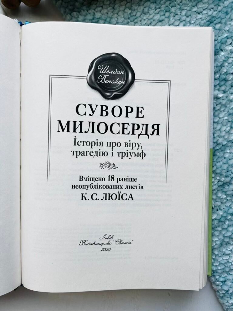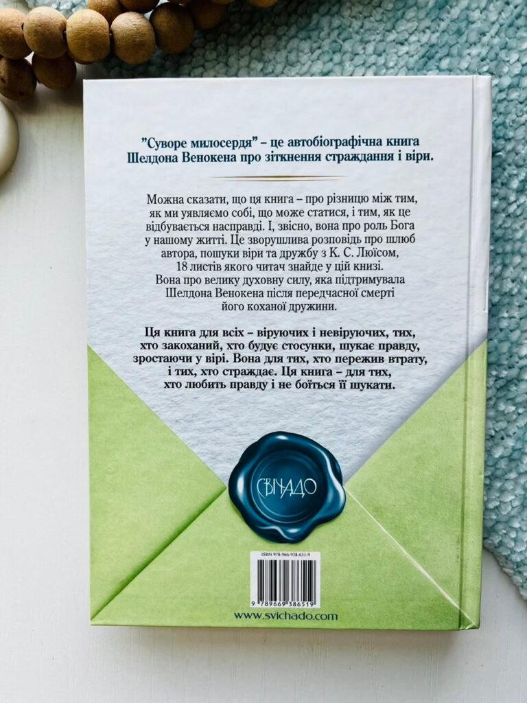 «Суворе милосердя» – це автобіографічна книга Шелдона Венокена про зіткнення страждання і віри. Можна сказати, що ця книга – про різницю між тим, як ми уявляємо собі, що може статися, і тим, як це відбувається насправді. І, звісно, вона про роль Бога у нашому житті. Це зворушлива розповідь про шлюб автора, пошуки віри та дружбу з К. С. Люїсом, 18 листів якого читач знайде у цій книзі. Вона про велику духовну силу, яка підтримувала Шелдона Венокена після передчасної смерті його коханої дружини. Ця книга для всіх — віруючих і невіруючих, тих, хто закоханий, хто будує стосунки, шукає правду, зростаючи у вірі. Вона для тих, хто пережив втрату, і тих, хто страждає. Ця книга – для тих, хто любить правду і не боїться її шукати.