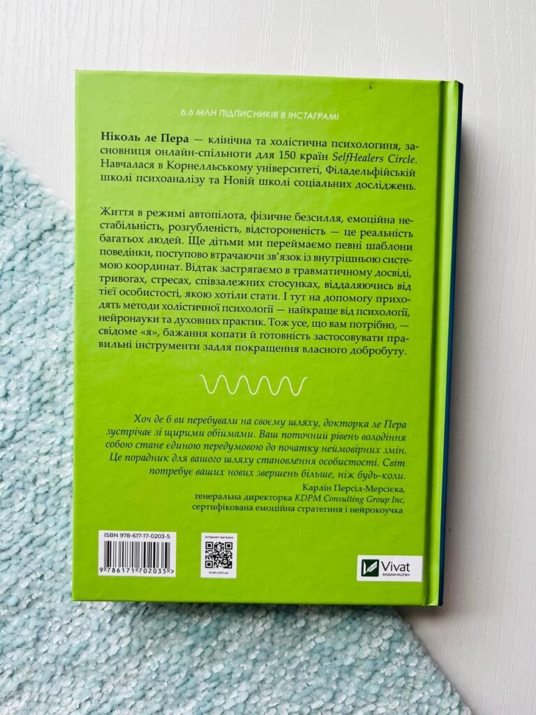 «Сяйво свідомого “я”»Життя в режимі автопілота, фізичне безсилля, емоційна нестабільність, розгубленість, відстороненість — це реальність багатьох людей. Ще дітьми ми переймаємо певні шаблони поведінки, поступово втрачаючи зв’язок із внутрішньою системою координат. Відтак застрягаємо в травматичному досвіді, тривогах, стресах, співзалежних стосунках, віддаляючись від тієї особистості, якою хотіли стати. І тут на допомогу приходять методи холістичної психології — найкраще від психології, нейронауки та духовних практик. Тож усе, що вам потрібно, — свідоме «я», бажання копати й готовність застосовувати правильні інструменти задля покращення власного добробуту.Детальніше про книгу Книга «Сяйво свідомого “я”» — психологічний путівник, який допоможе знайти дорогу до себе серед хащі когнітивних помилок, нагромадження хибних установок та нав’язаних нам ще у дитинстві руйнівних патернів поведінки. Створений на засадах холістичної психології — психології цілісності фізичного, емоційного та духовного, він допоможе зібратися докупи там, де стрес, тривога та апатія перетворюють життя на існування в режимі автопілота. Нікль Ле Пера, авторка — дослідниця та клінічна психологиня, поєднала у своїй праці наукове підґрунтя та вміння звернутися до читача мовою любові та турботи, зрозумілої усьому живому. Її нофікшн-книга містить дослідження у різних галузях, зокрема — психології, нейробіології та духовних практик. Поступово віднаходячи ключі до взаємодії тіла, розуму та душі, читач приходить до більш гармонійного та усвідомленого життя, яке можливе тільки за умови, коли ви усвідомлюєте свої потреби та внутрішні ресурси.Шлях до психічного добробуту У своїй книзі Ніколь Ле Пера торкається таких важливих тем: Як емоційний стан впливає на тіло та якість життя та як обернути силу емоцій на свою користь. Як формуються звички та поведінкові патерни у дитинстві та чи можна змінити їх у дорослому віці. (Спойлер — можна, і як це зробити, ви довідаєтеся із практичних вправ, наведених дослідницею. Чому дорослі люди так часто відчувають апатію, депресію та емоційне вигоряння і як цьому зарадити. Як травма, навіть отримана багато років тому, «осідає» на нашій психіці та як лишити психотравму в минулому, мінмізувавши її вплив на життя. Травму неможливо скасувати, але завжди можна переграти цей сценарій, перетворивши її на цінний досвід, який допоможе розквітнути та засяяти свідомому «Я», переконана авторка. Які фактори блокують гармонійний саморозвиток та як виключити їх зі свого життя. Як зцілити себе та жити щасливо на прикладі історій з реального життя Авторка також торкається теми токсичних стосунків (аб’юзивних та співзалежних, або таких, де людину не цінують). У книзі читач знайде способи виходу з таких стосунків, способи відновлення самоцінності та самоідентифікації та навчиться встановлювати власні межі. Купити «Сяйво свідомого “”я””. Як зцілити душу, тіло та розум ізсередини» корисно не лише тим, хто вдчуває потребу у самодопомозі та самозціленні, але й будь-кому, хто зацікавлений у саморозвитку та профілактиці психічних, емоційних та душевних травм. «Авторка описує все на прикладі свого життєвого шляху та досвіду своїх клієнтів, що, як на мене, зробило цю книжку максимально живою і загалом читабельною, а не якимось набором