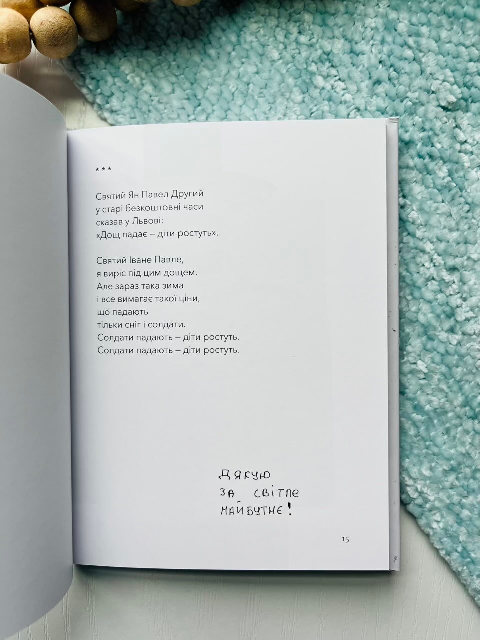 Вірші цієї поетичної збірки написані на фронті, але вони не про війну. Вони про людей, які люблять більше, ніж бояться. Які були тут і не пішли звідси. Такою мовою солдати згадують своїх, а діти пишуть листи на аркушах шкільного зошита. Нею говорять про біль і надію. Прощаються і люблять.