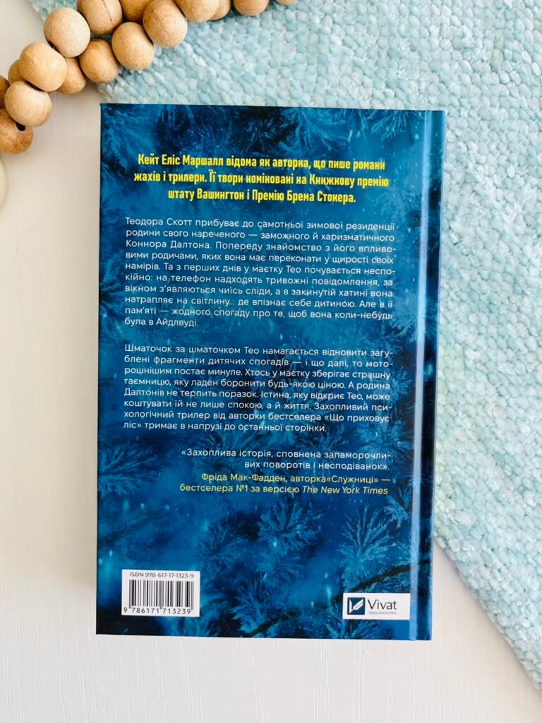 Шматочок за шматочком Тео намагається відновити загублені фрагменти дитячих спогадів — і що далі, то моторошнішим постає минуле. Хтось у маєтку зберігає страшну таємницю, яку ладен боронити будь-якою ціною. А родина Далтонів не терпить поразок. Істина, яку відкриє Тео, може коштувати їй не лише спокою, а й життя. Захопливий психологічний трилер від авторки бестселера «Що приховує ліс» тримає в напрузі до останньої сторінки.