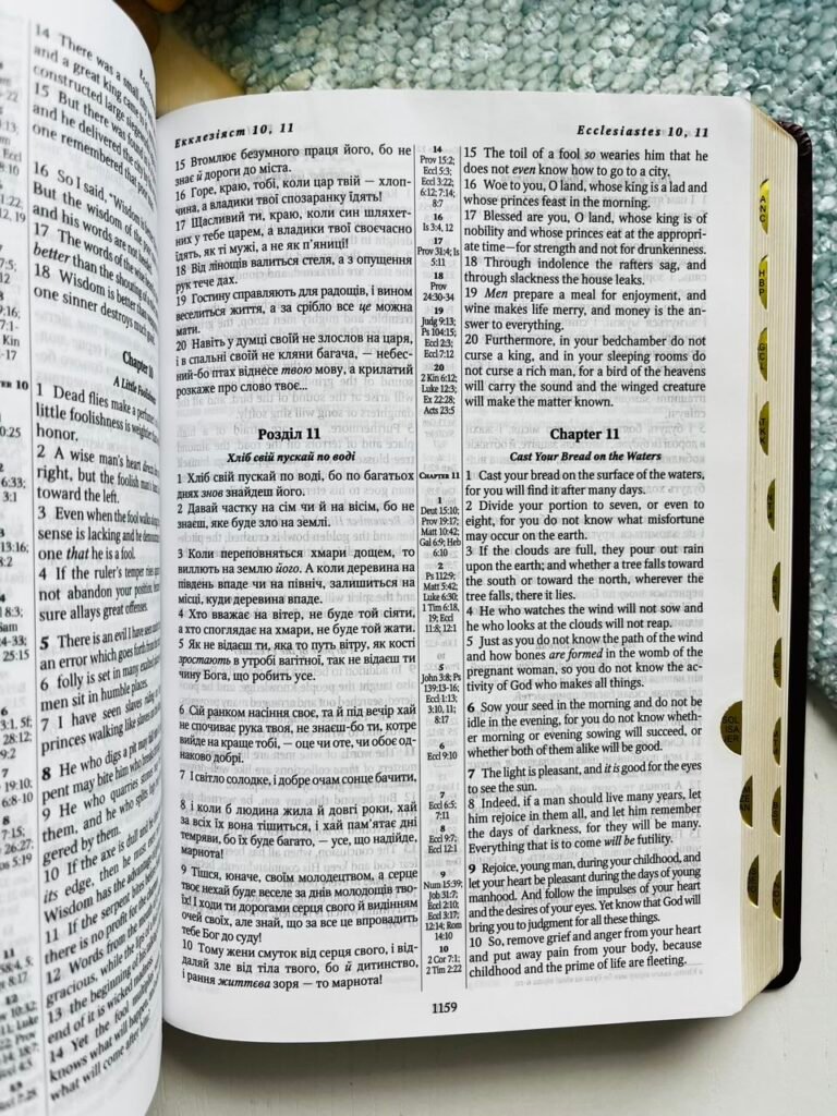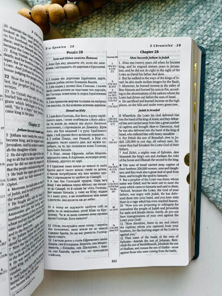 Українсько-англійська Біблія з паралельним текстом, що містить канонічні 66 книг.