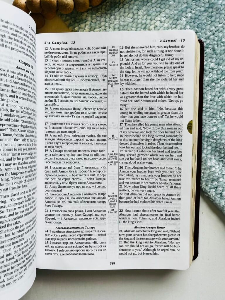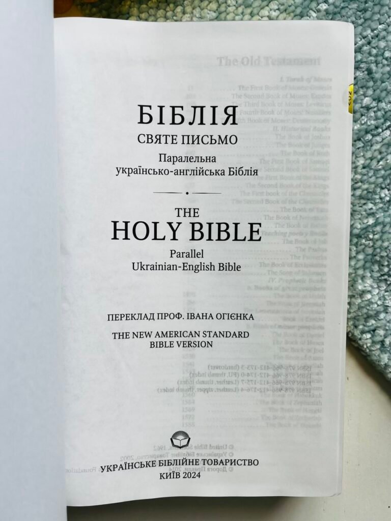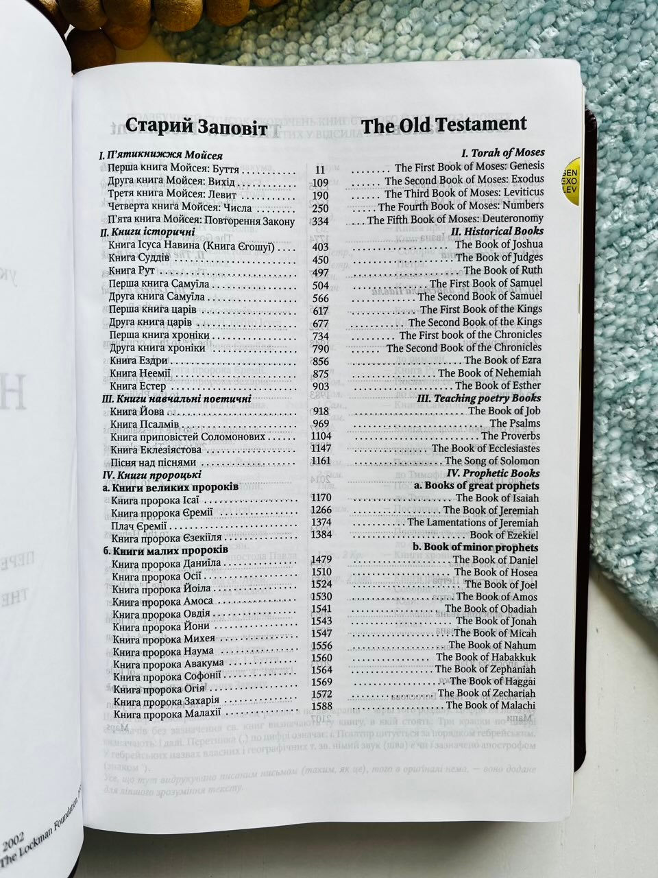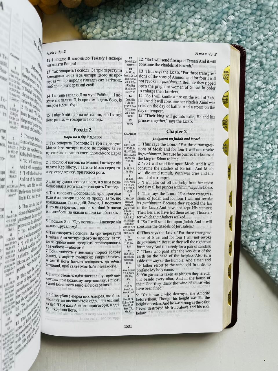 Українсько-англійська Біблія з паралельним текстом, що містить канонічні 66 книг.