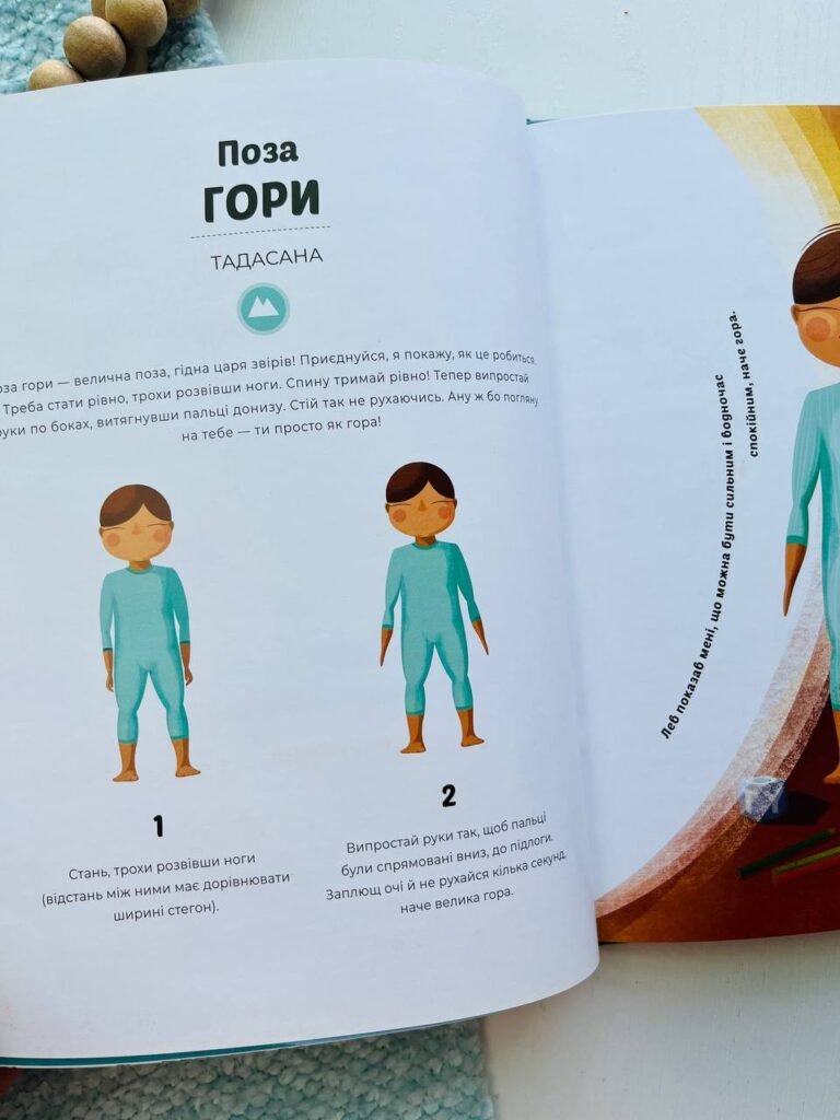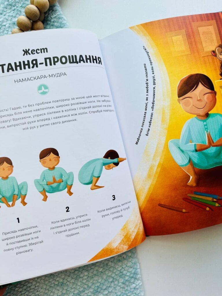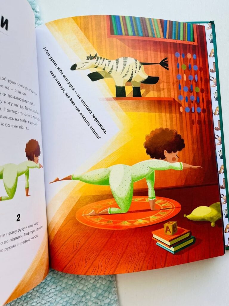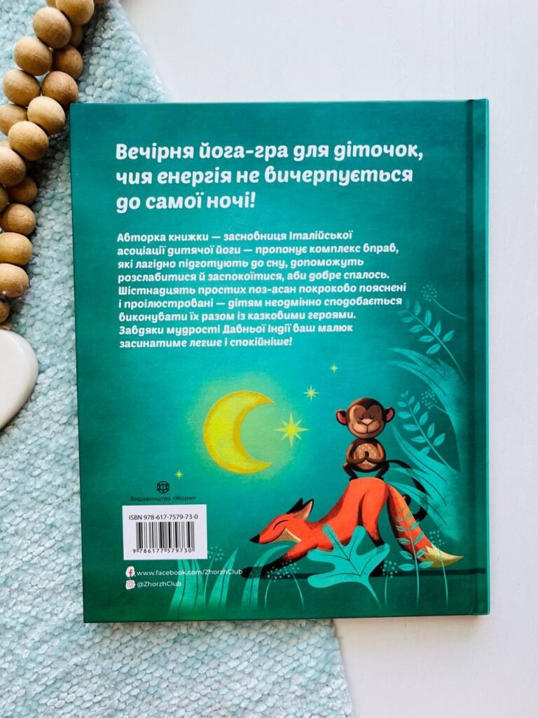Авторка книжки — засновниця Iталiйськоï асоцiацiï дитячоï йоги — пропонує комплекс вправ, якi лагiдно пiдготують до сну, допоможуть розслабитися й заспокоïтися, аби добре спалось. Шiстнадцять простих поз-асан покроково поясненi i проiлюстрованi — дiтям неодмiнно сподобається виконувати ïх разом iз казковими героями. Завдяки мудростi Давньоï Iндiï ваш малюк засинатиме легше i спокiйнiше!