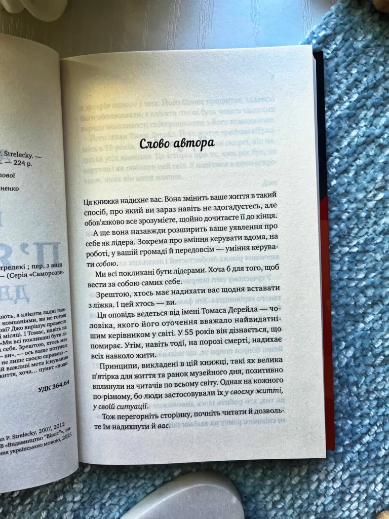 Коли ваш бізнес процвітає, підлеглі вас обожнюють, а клієнти ладні тижнями чекати можливості співпрацювати з вашими компаніями, ви не готові прийняти свою незабарну смерть у 55 років. Чи готові? Джо вирішує провести зі своїм невиліковно хворим наставником останні місяці. І Томас, навіть на порозі смерті, надихає жити та ділиться досвідом. «Ми всі покликані бути лідерами. Хоча б для того, щоб вести за собою самих себе. Зрештою, хтось має надихати вас щодня вставати з ліжка. І цей хтось — ви», — ось ваше потужне нагадування про те, що успішні лідери займаються не лише своєю справою — вони займаються справою життя. Справою, у якій важливі мета існування і попутники. У кожного своя велика п’ятірка для життя, хоча… пункт «подорожі світом» є у великих п’ятірках 95% людей.